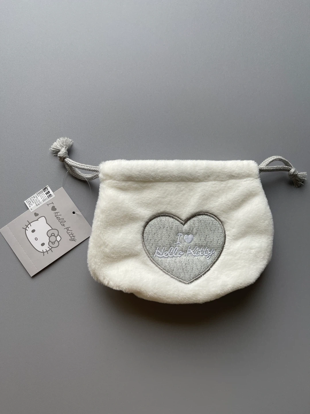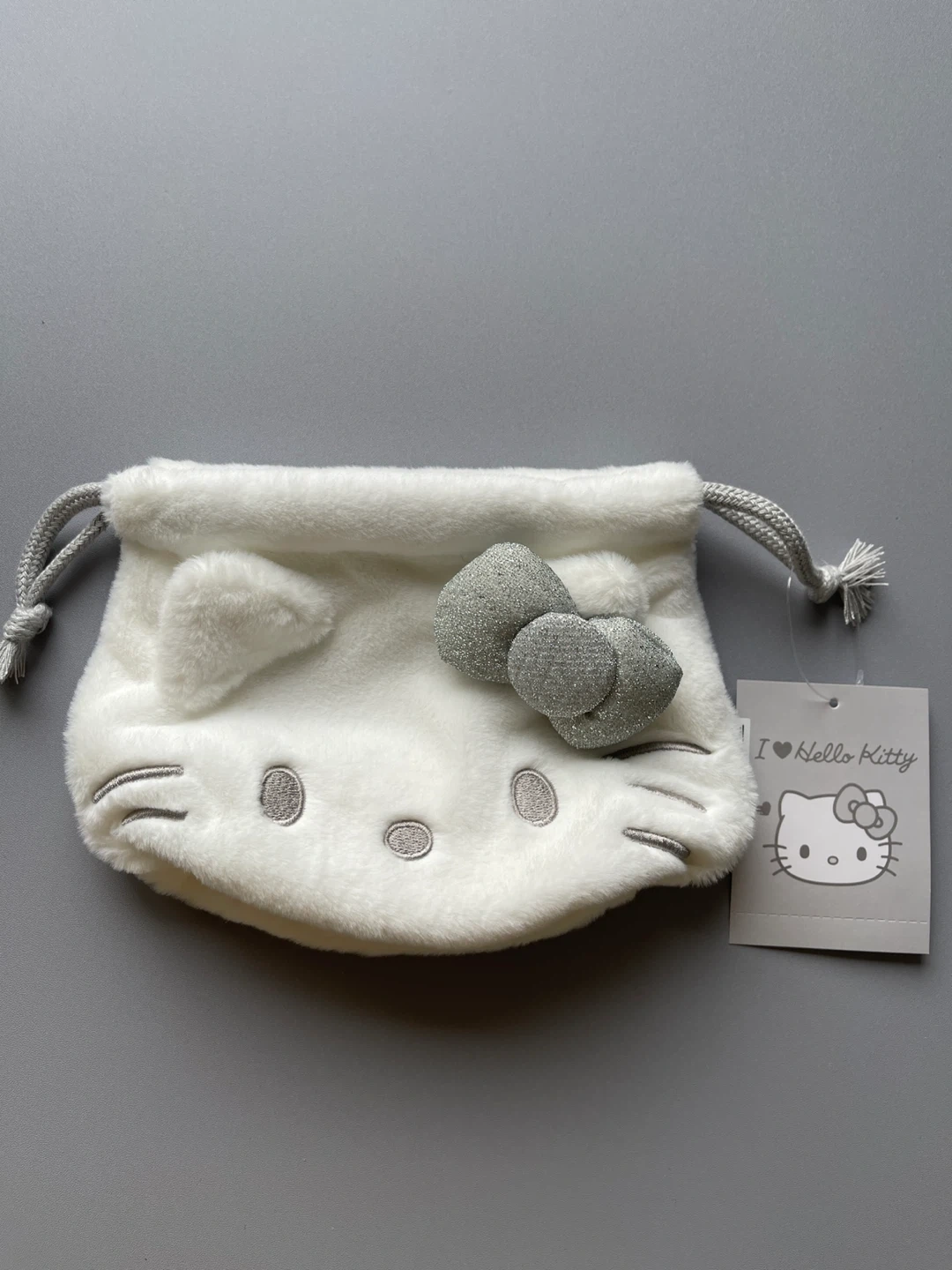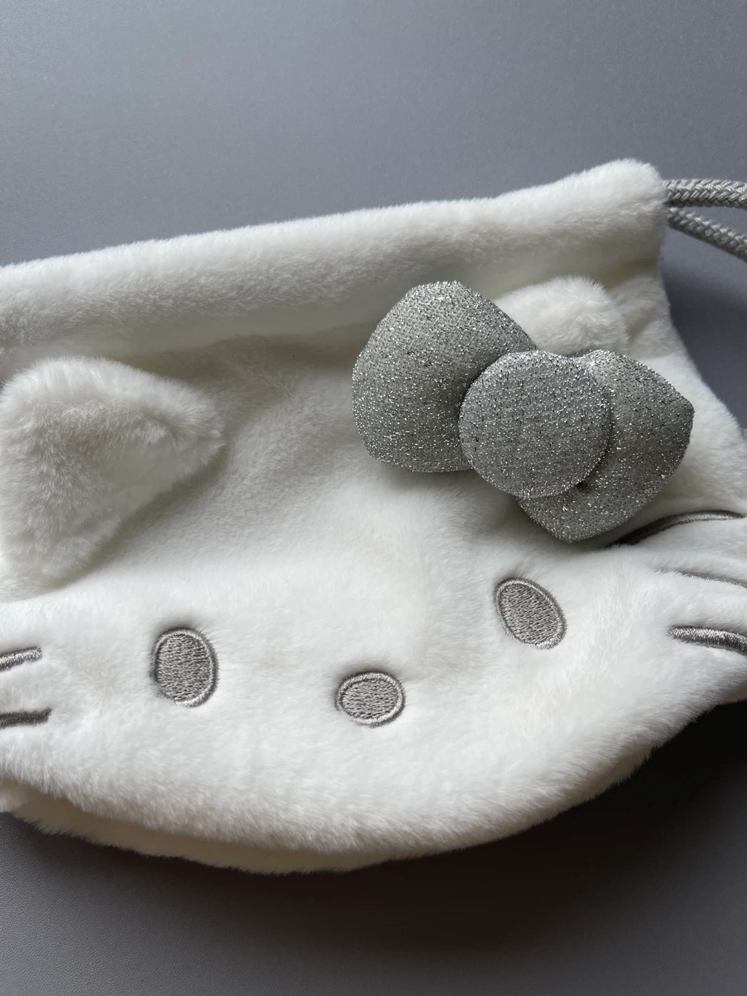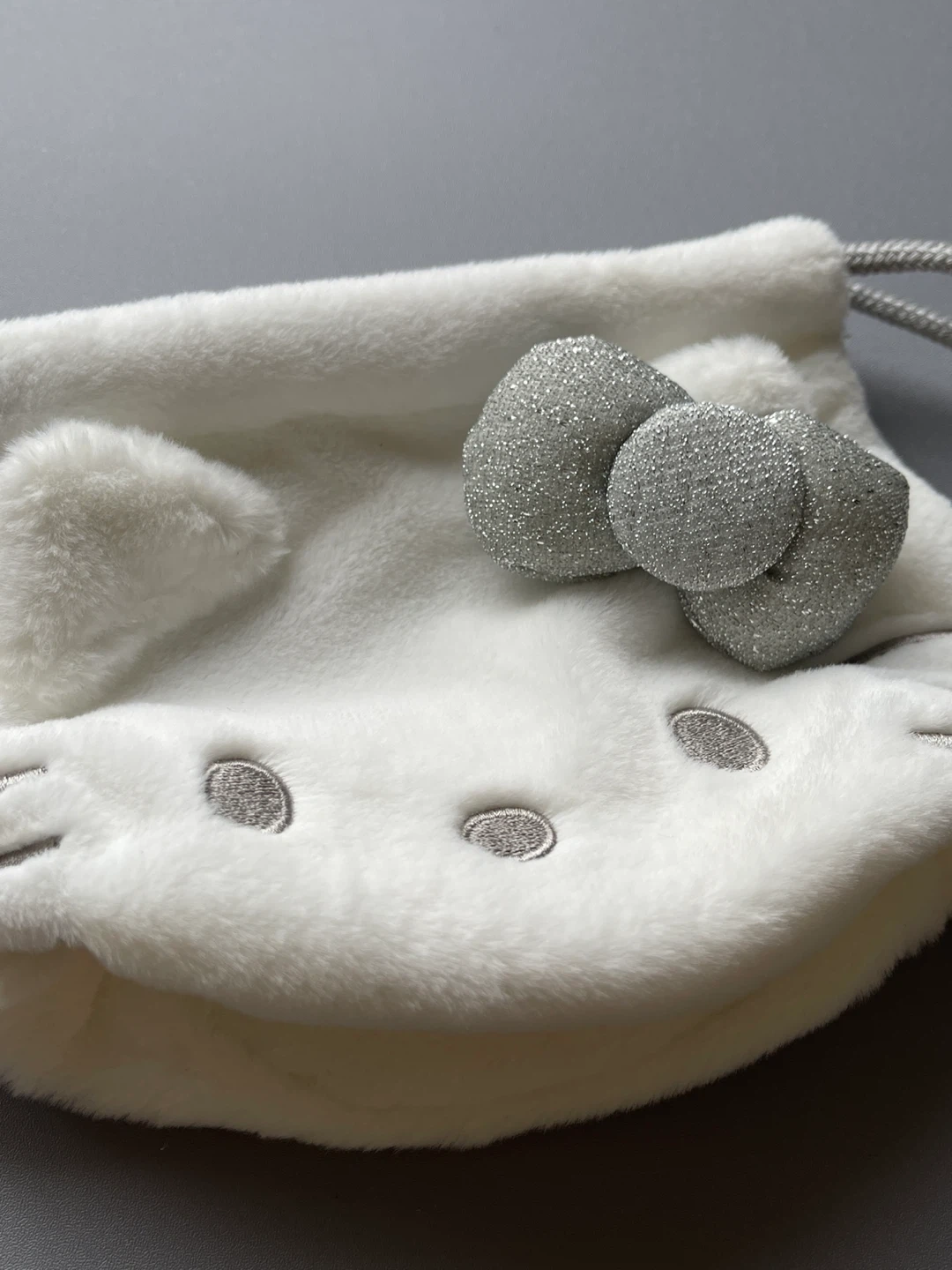 White plush drawstring pouch bag featuring a Hello Kitty face design with glittery bow. It has embroidered eyes and whiskers.