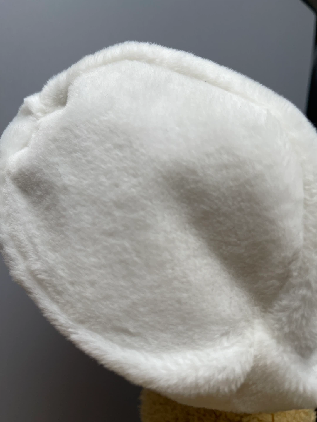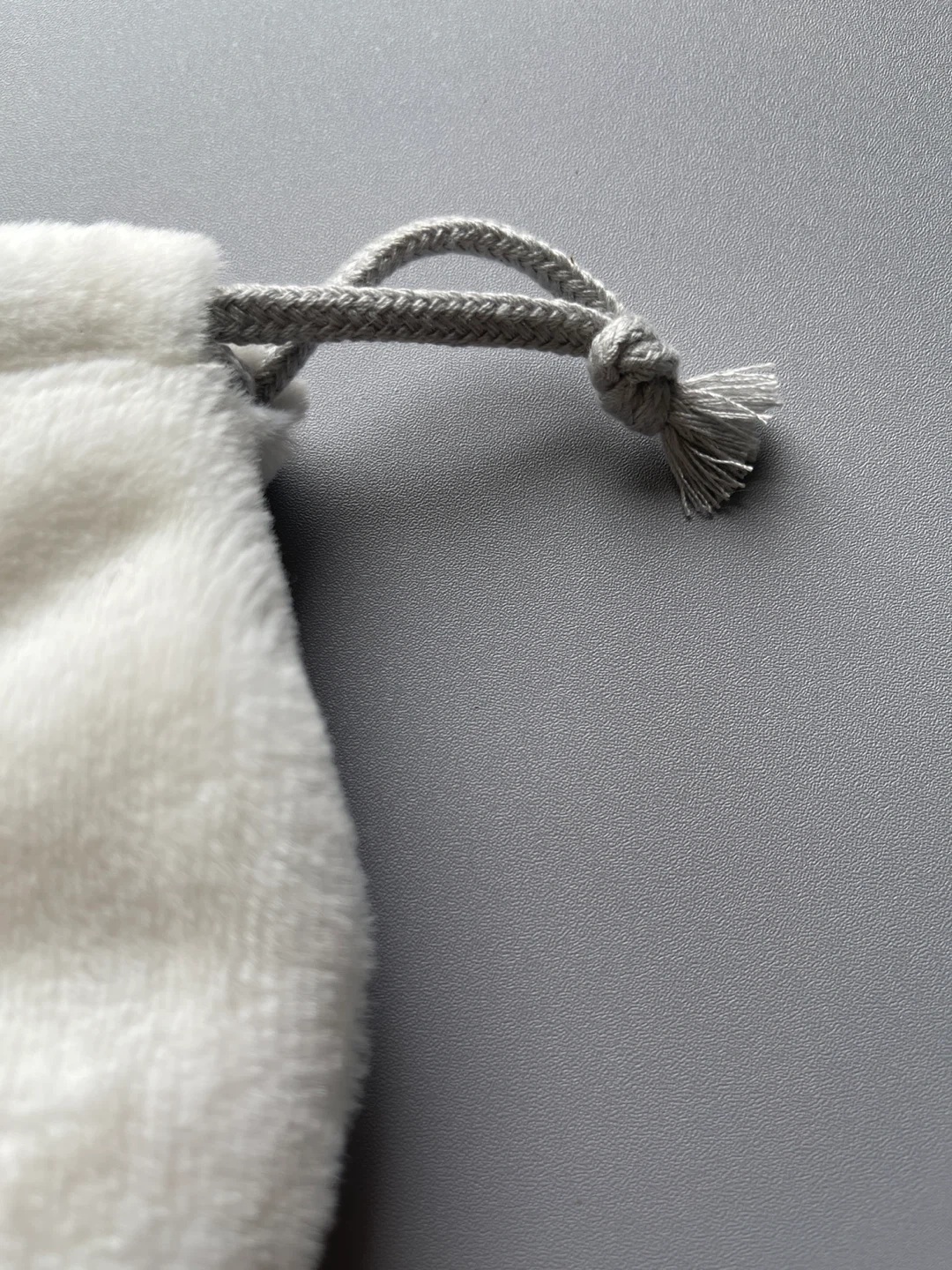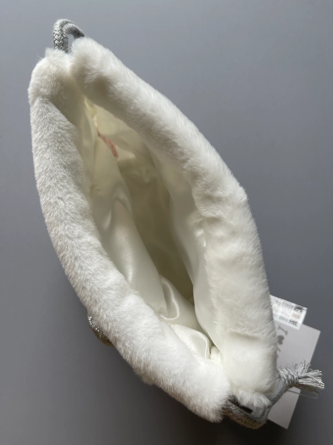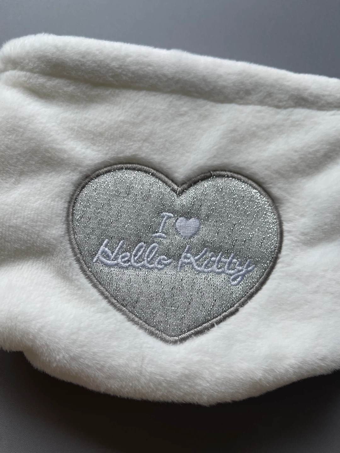 White plush drawstring pouch bag featuring a Hello Kitty face design with glittery bow. It has embroidered eyes and whiskers.