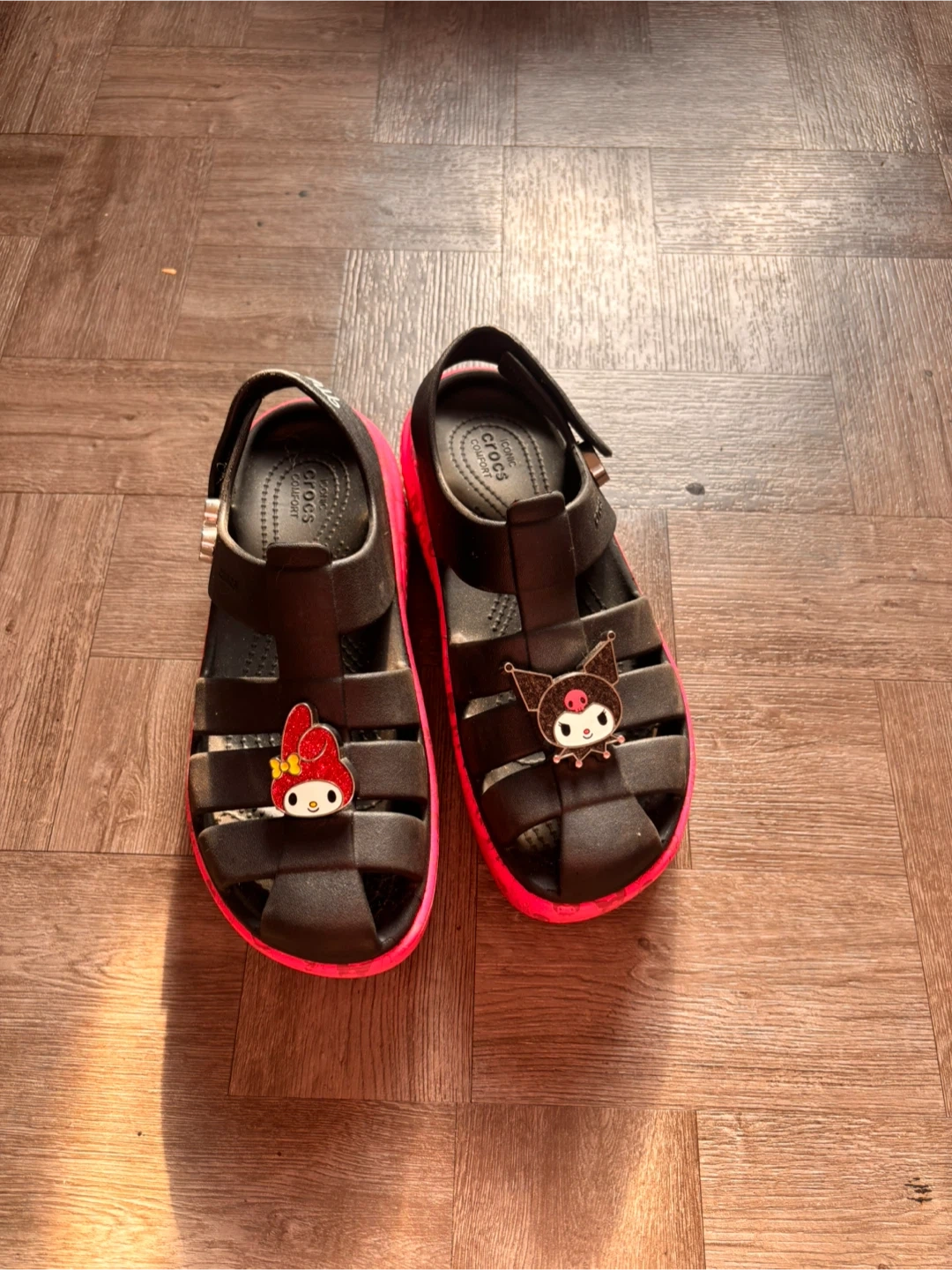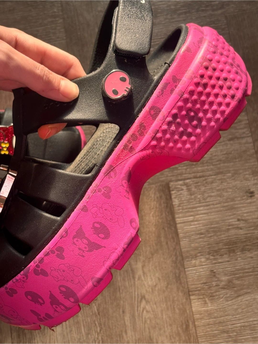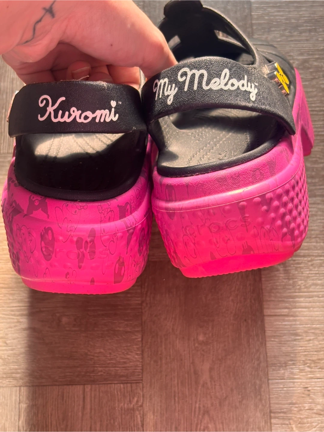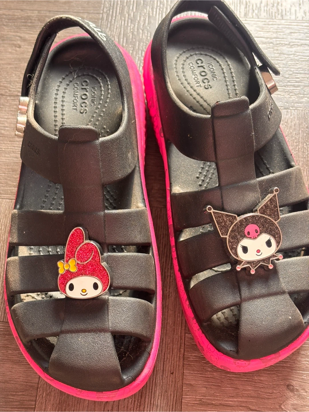 Black Crocs sandals with bright pink soles featuring My Melody and Kuromi charms. These kids' sandals are made of Croslite material. Great for everyday wear!
