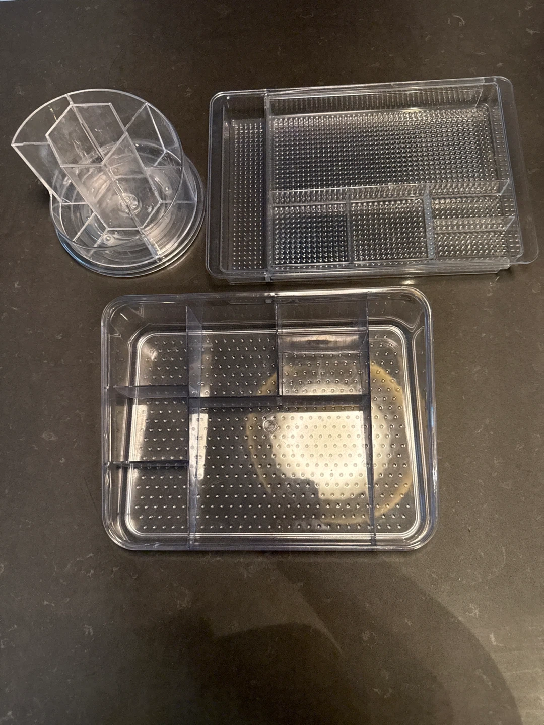 Two clear plastic organizers for makeup and desk items. One is a rotating organizer with multiple compartments, and the other is a rectangular tray with various sections. Great for keeping surfaces tidy!