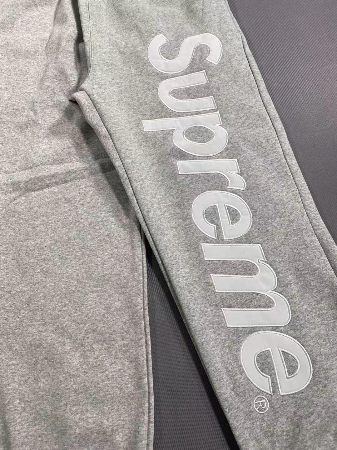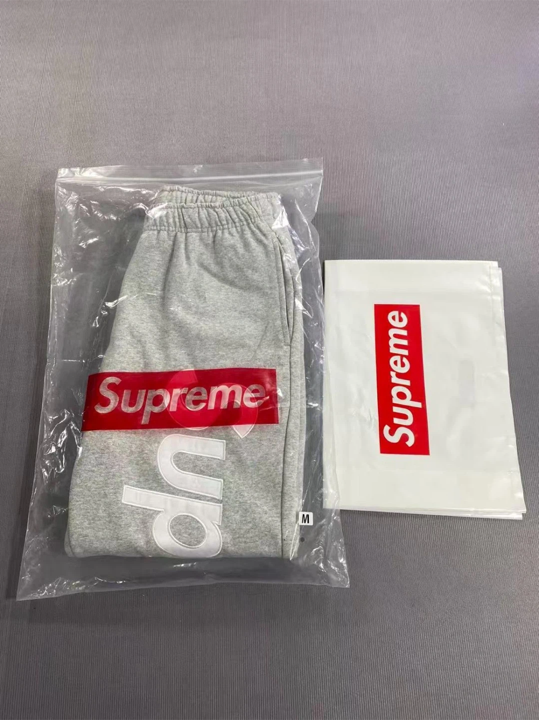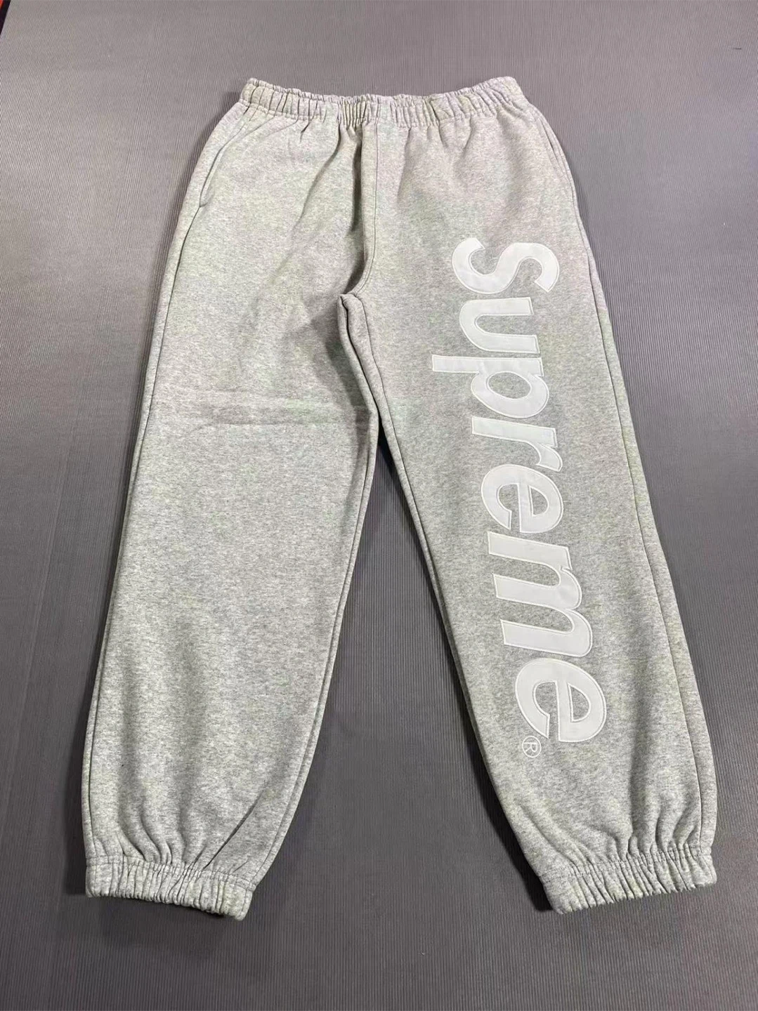 These are grey Supreme sweatpants with the iconic logo printed vertically on the side. They're made from a comfortable cotton blend and feature an elastic waistband with a drawstring. Includes original packaging and tags.