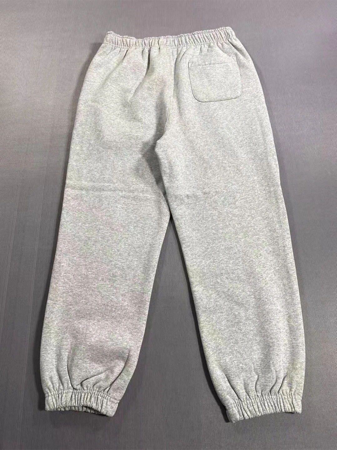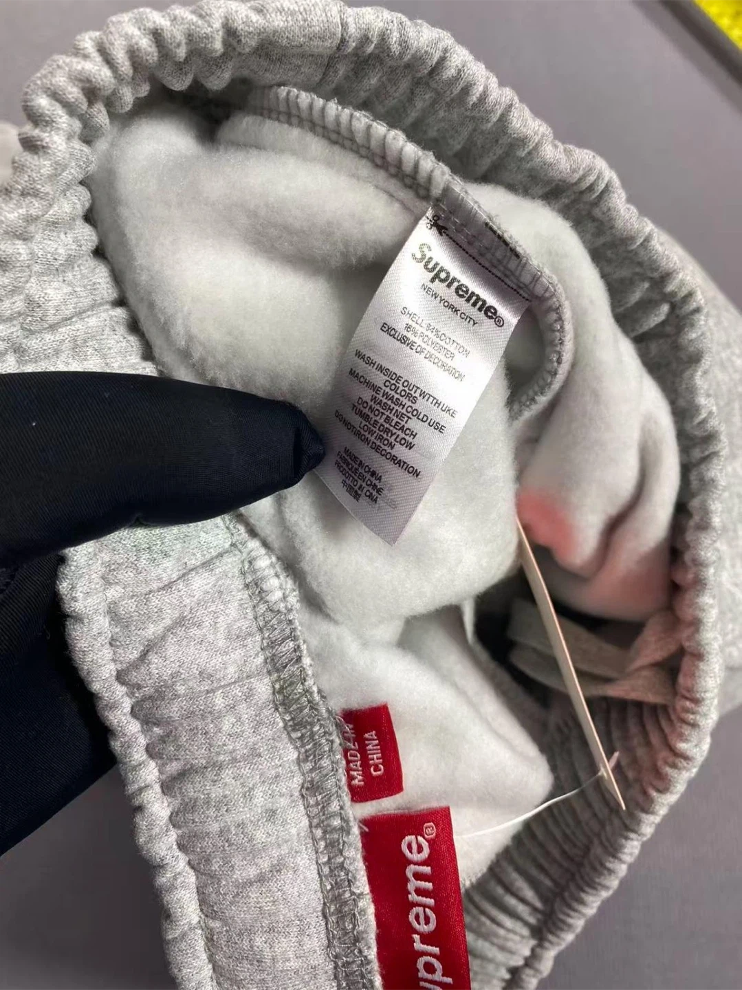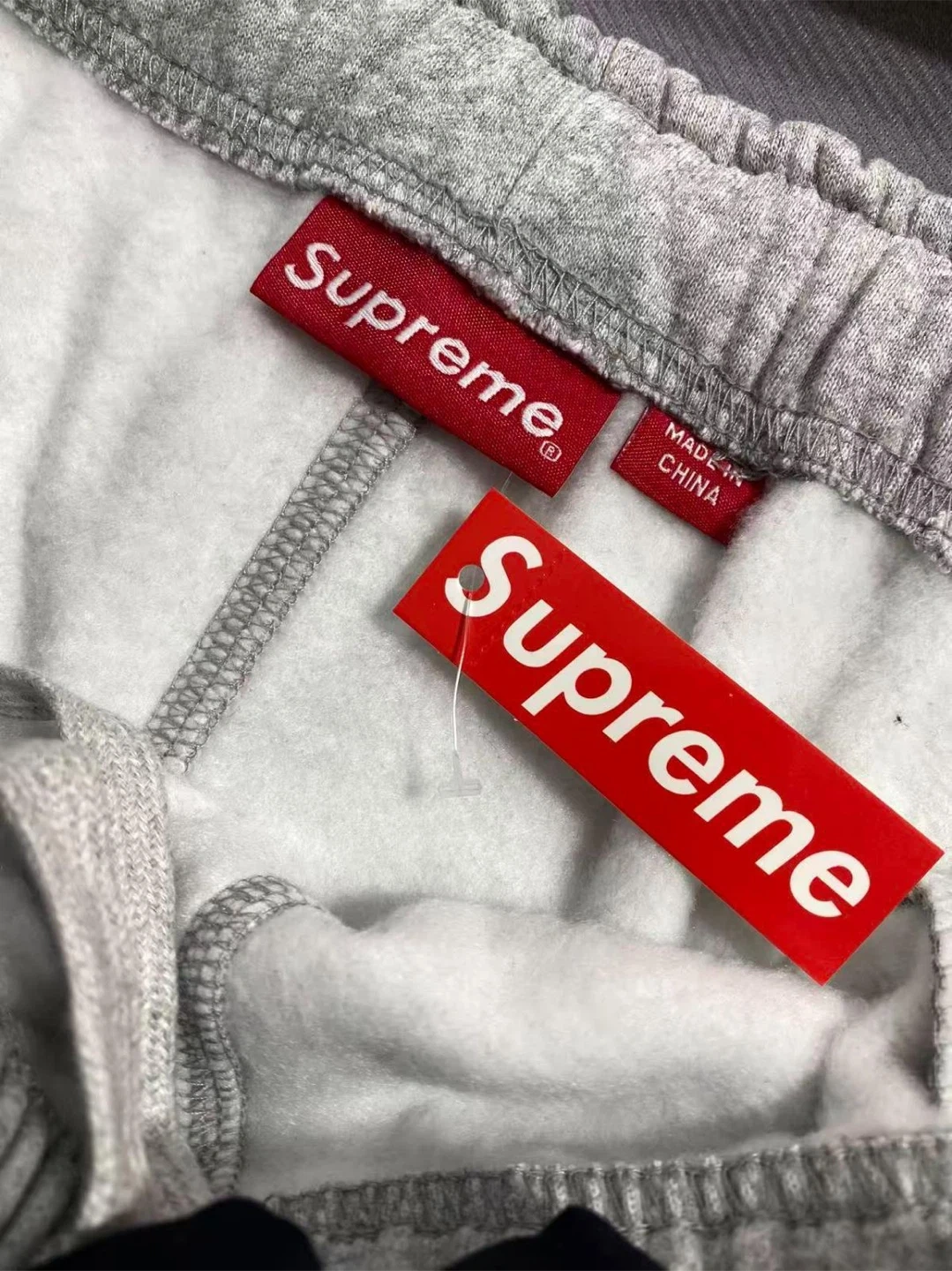 These are grey Supreme sweatpants with the iconic logo printed vertically on the side. They're made from a comfortable cotton blend and feature an elastic waistband with a drawstring. Includes original packaging and tags.