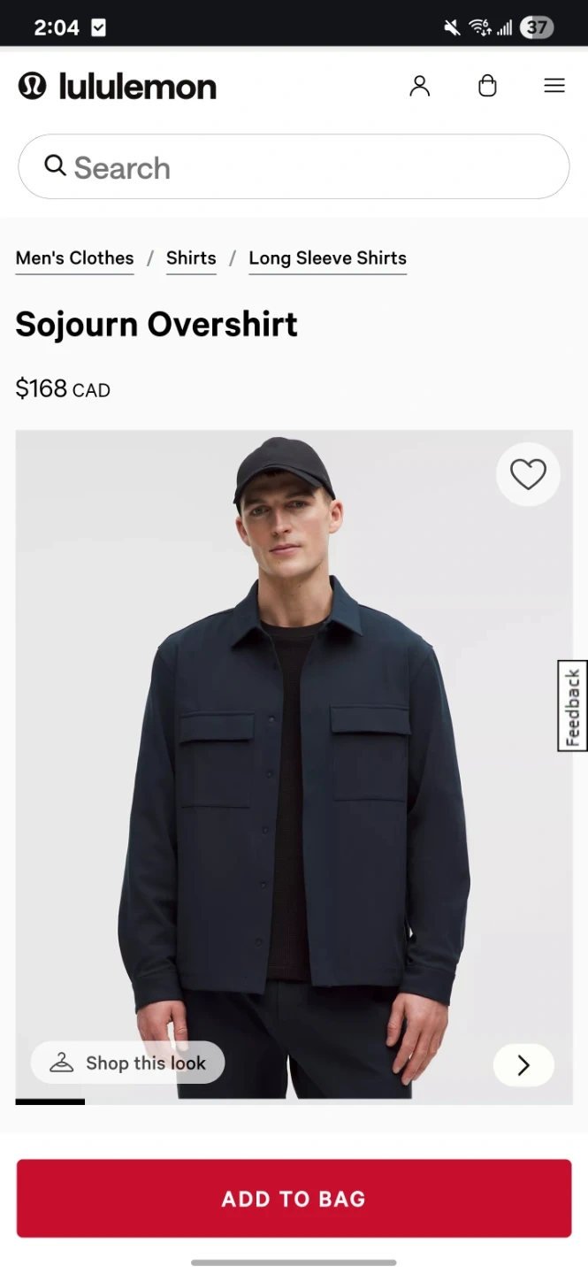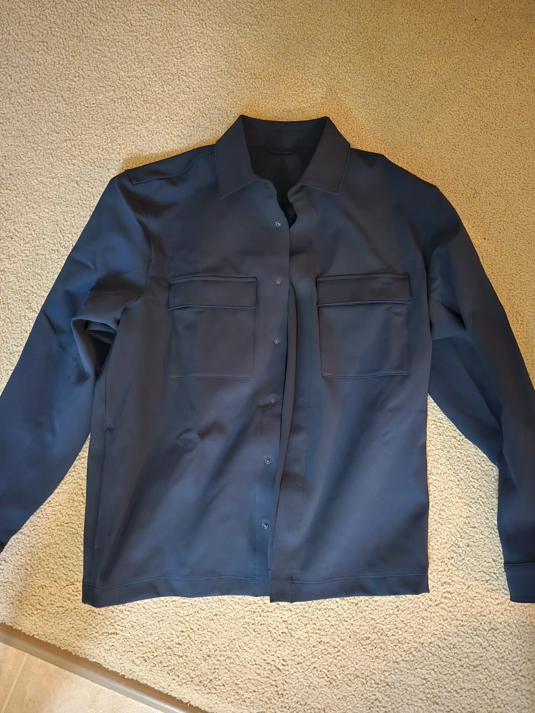 Lululemon Sojourn Overshirt in navy blue. This long-sleeve shirt features two chest pockets and a button-up front. It's a versatile layering piece. Worn once