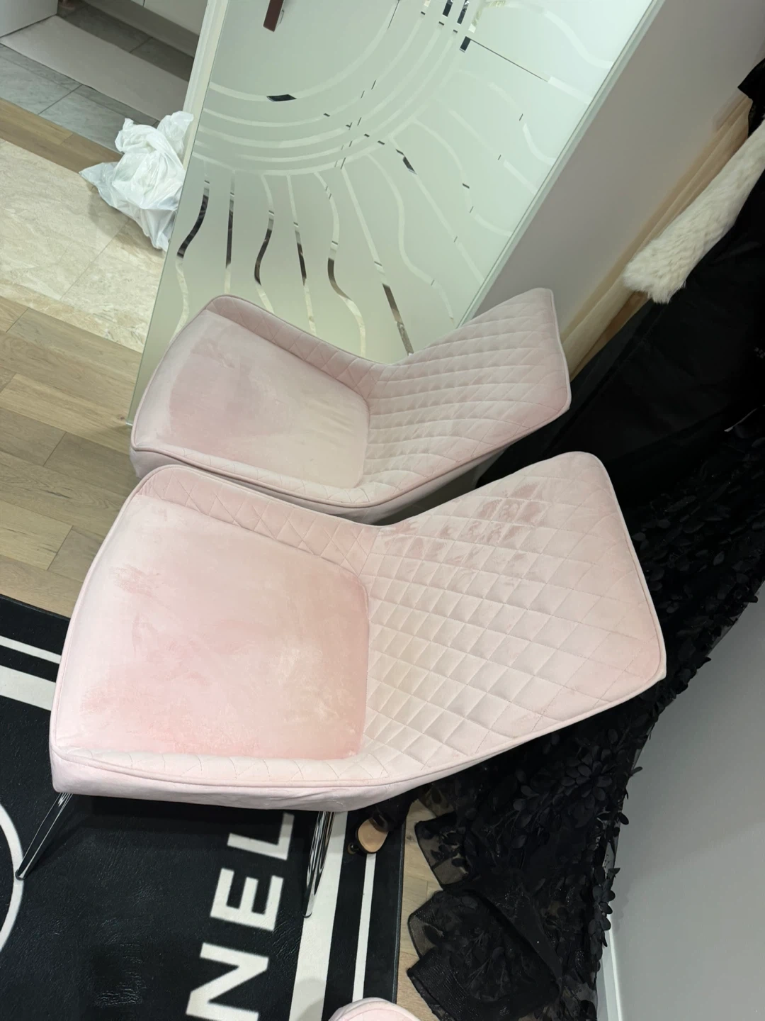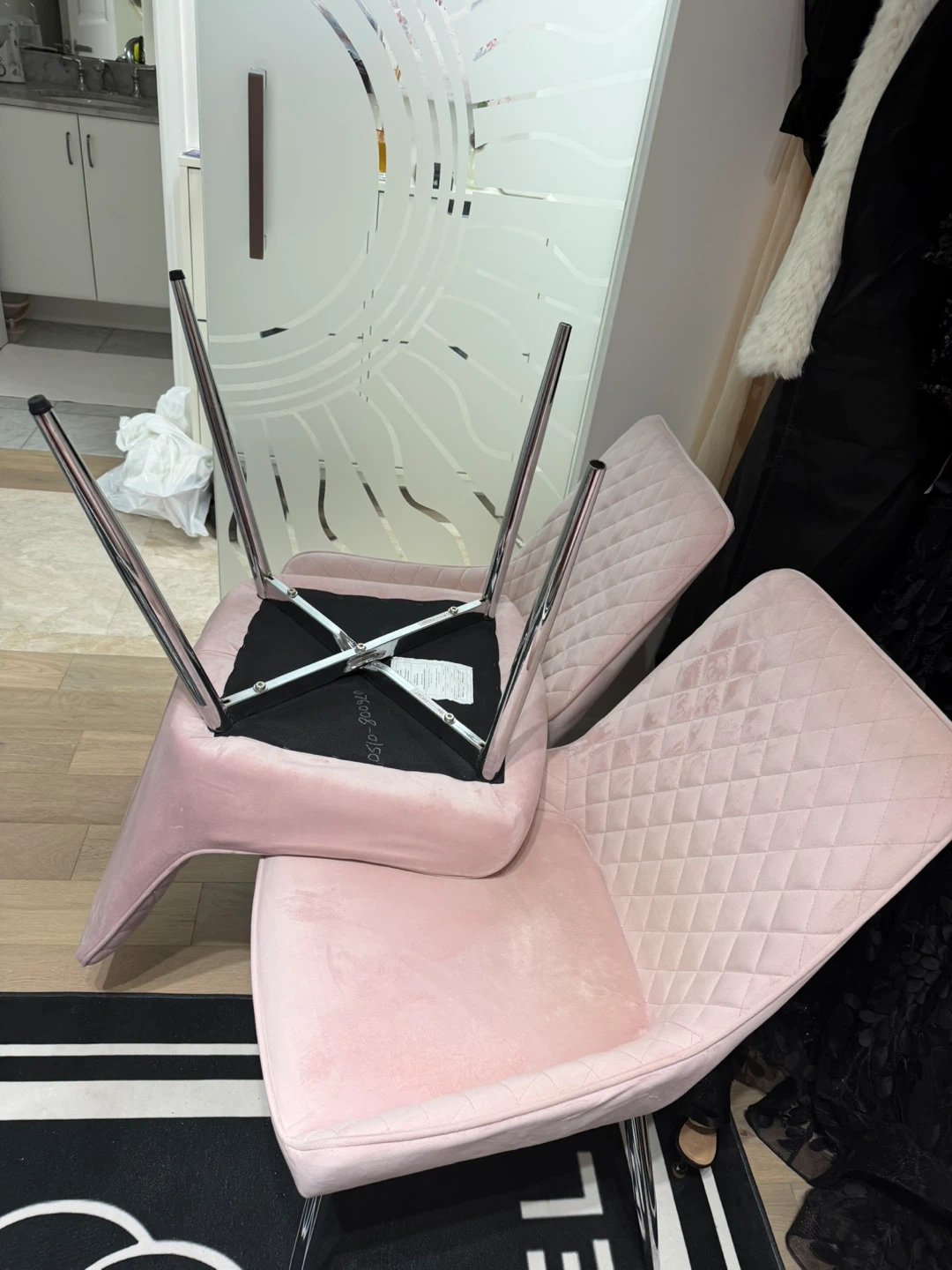 Selling a set of three stylish pink dining chairs! They feature a lovely quilted pattern and would add a touch of elegance to any dining space. They are in great condition and ready for a new home!