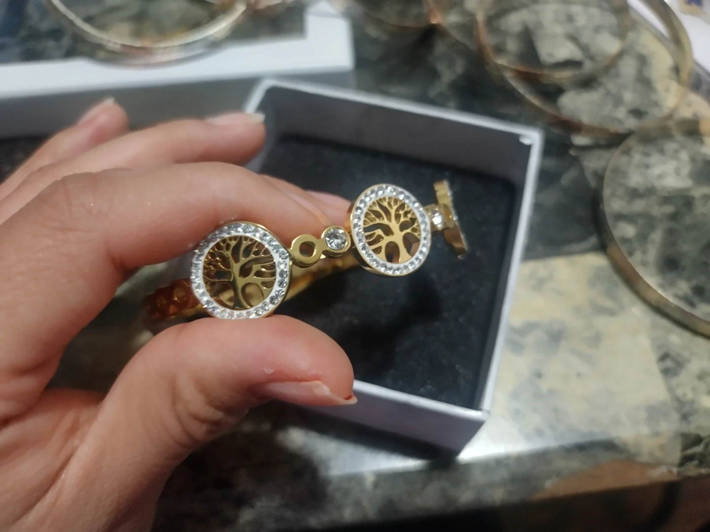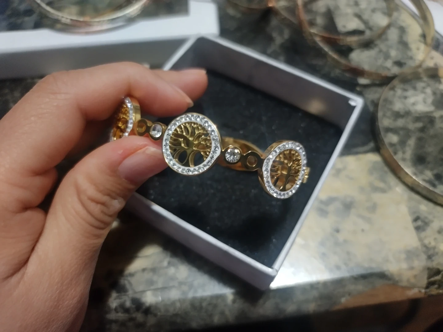 This gold-tone bracelet features a circular design with a detailed tree of life motif. It's embellished with clear rhinestones for a touch of sparkle. The bracelet is presented in a small gift box.