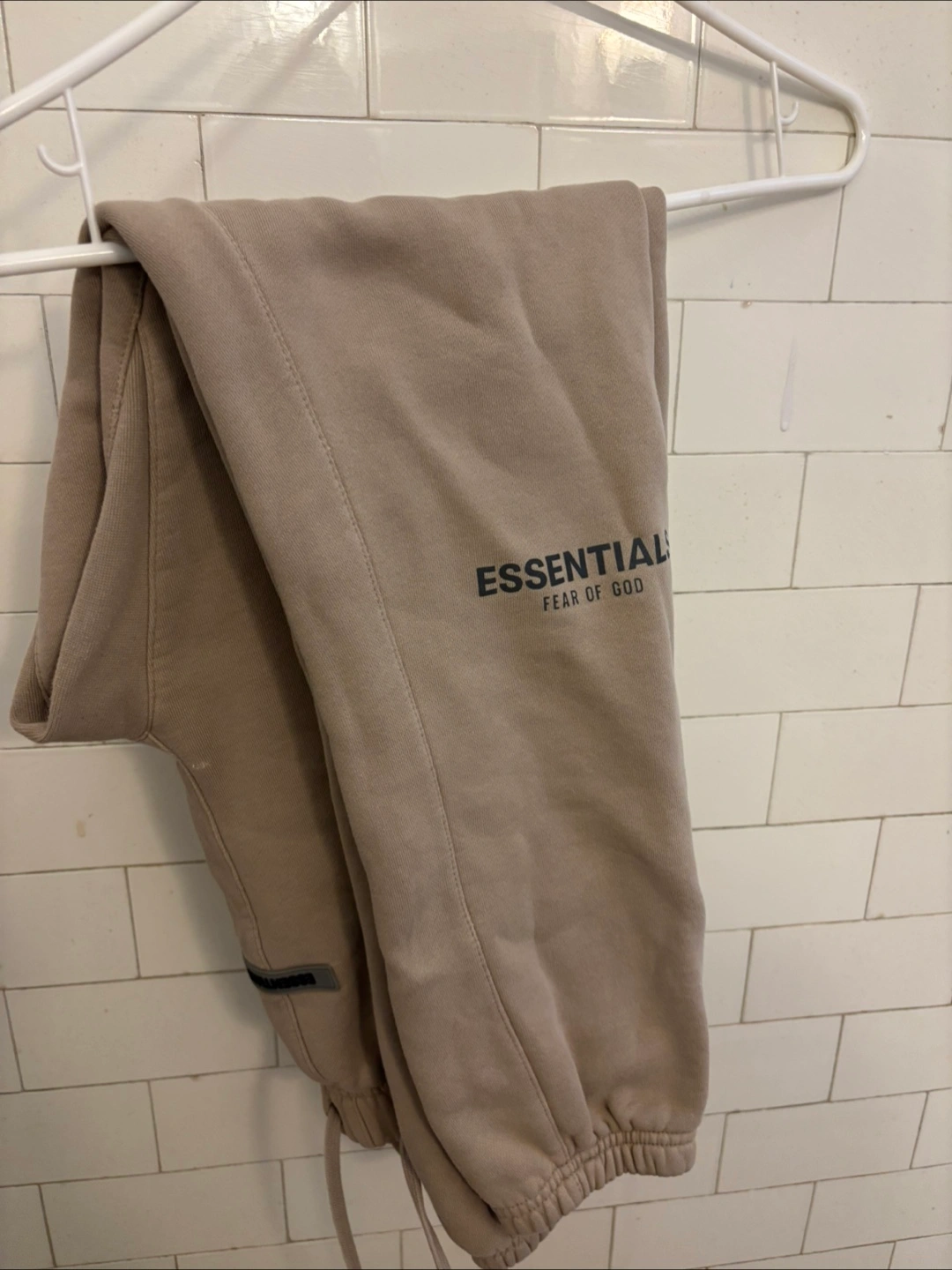 Selling a pair of Essentials Fear of God sweatpants in a beige color. They're in great condition and ready for a new home! The material is soft and comfortable, perfect for lounging or running errands. Feel free to reach out with any questions!