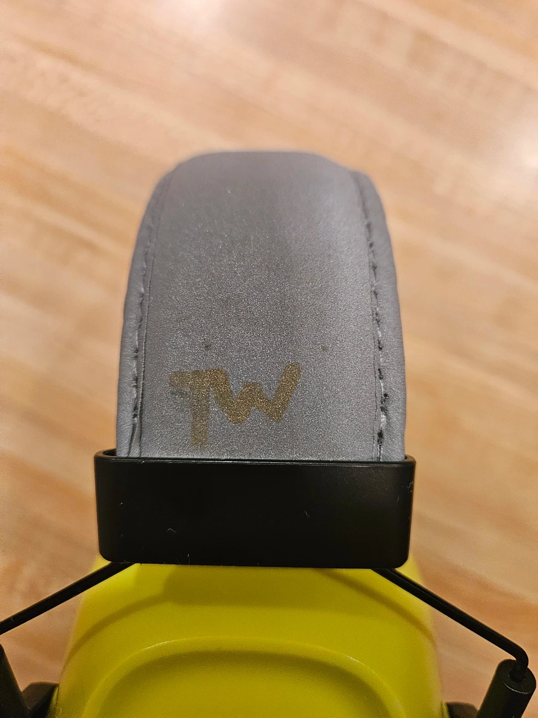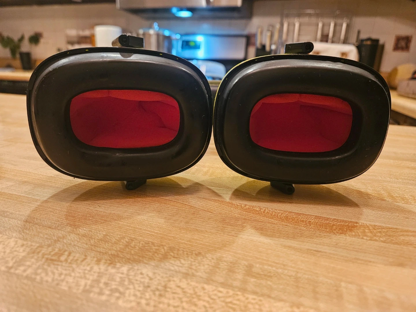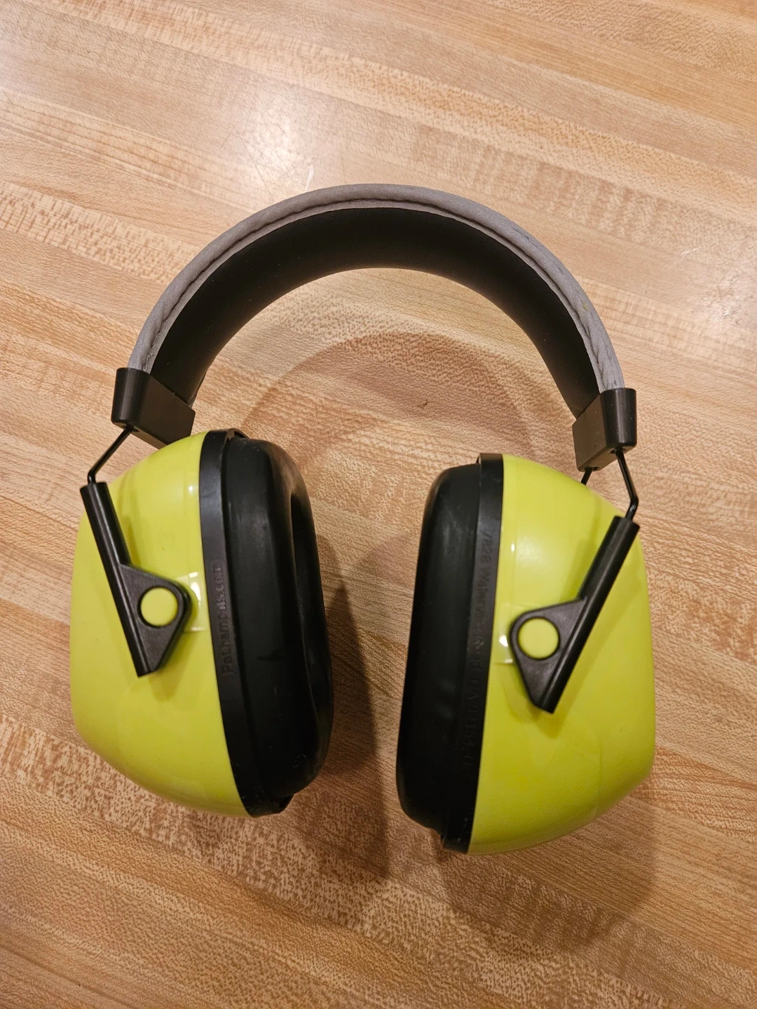 These are Honeywell Howard Leight VS 130HV earmuffs. They are bright yellow and black with a gray padded headband. Foam ear cups provide noise reduction.