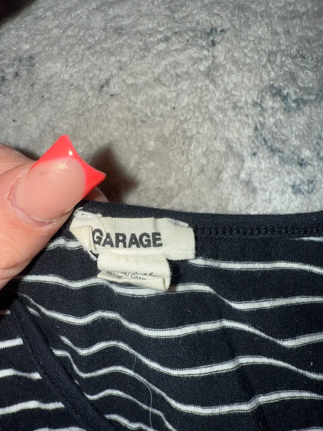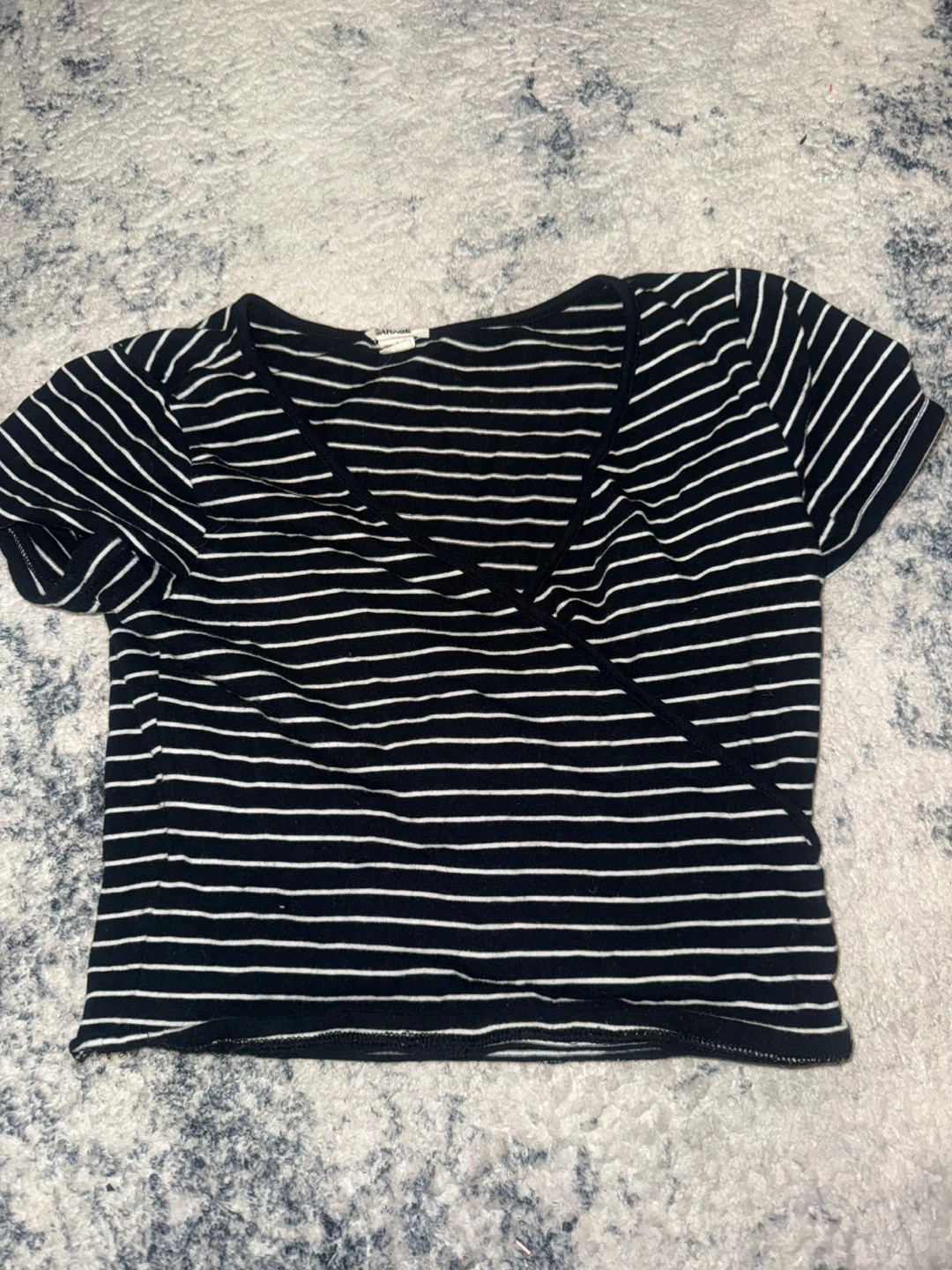 Garage black and white striped wrap crop top. Short sleeves and V-neckline. Cotton blend fabric.