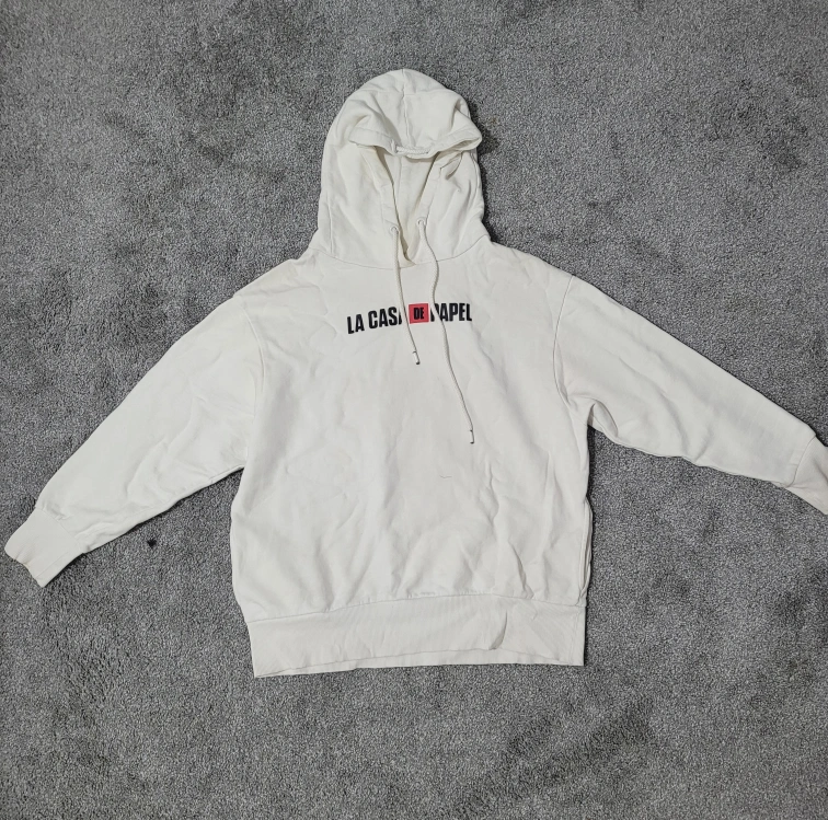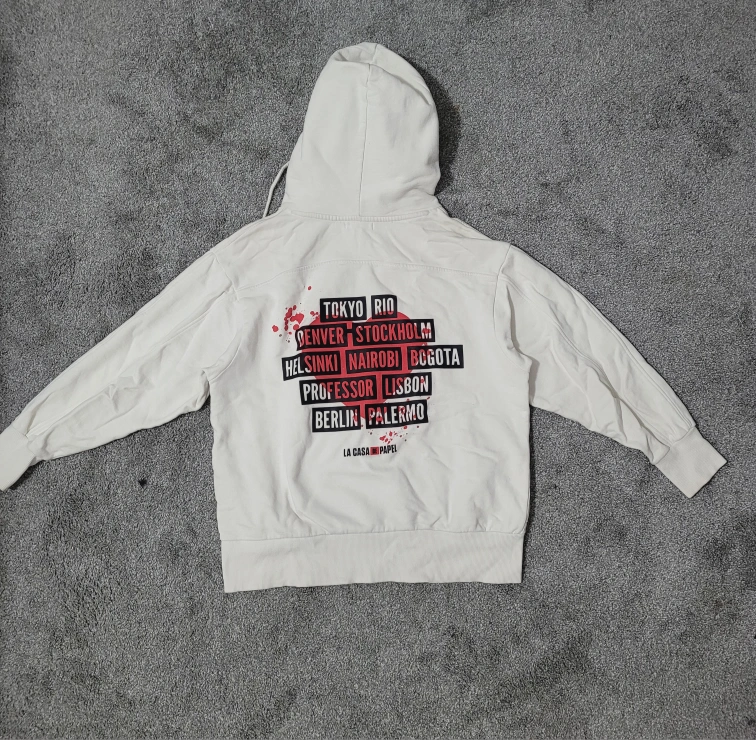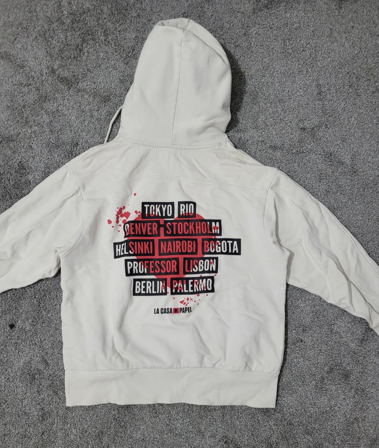Selling a hoodie featuring the La Casa de Papel (Money Heist) design! It's a size small and in great condition. The hoodie is white with the show's logo and city names printed on the back. Perfect for any fan of the series!