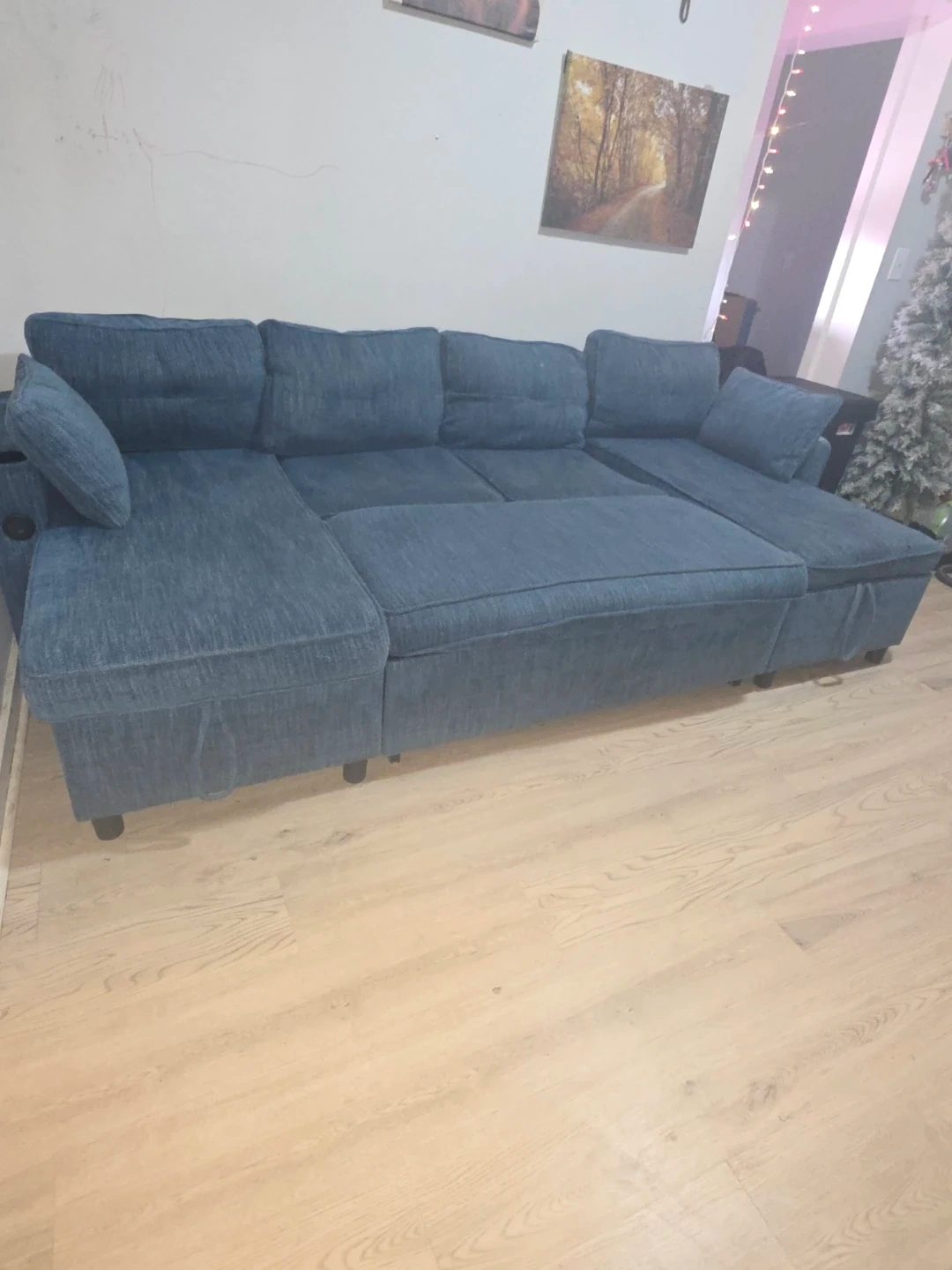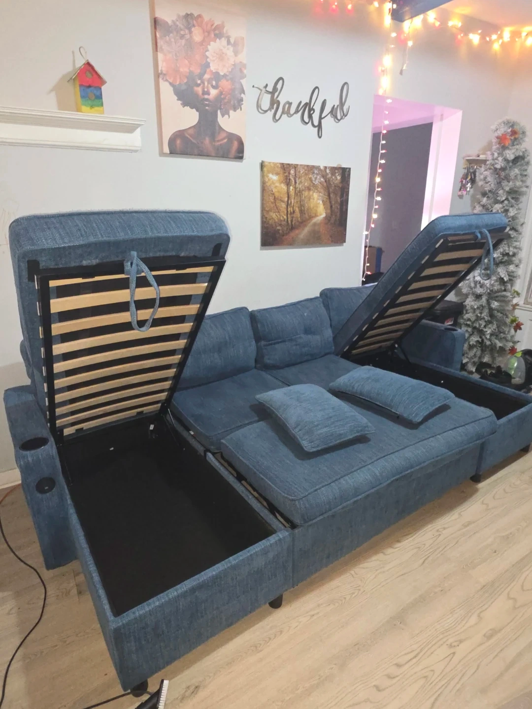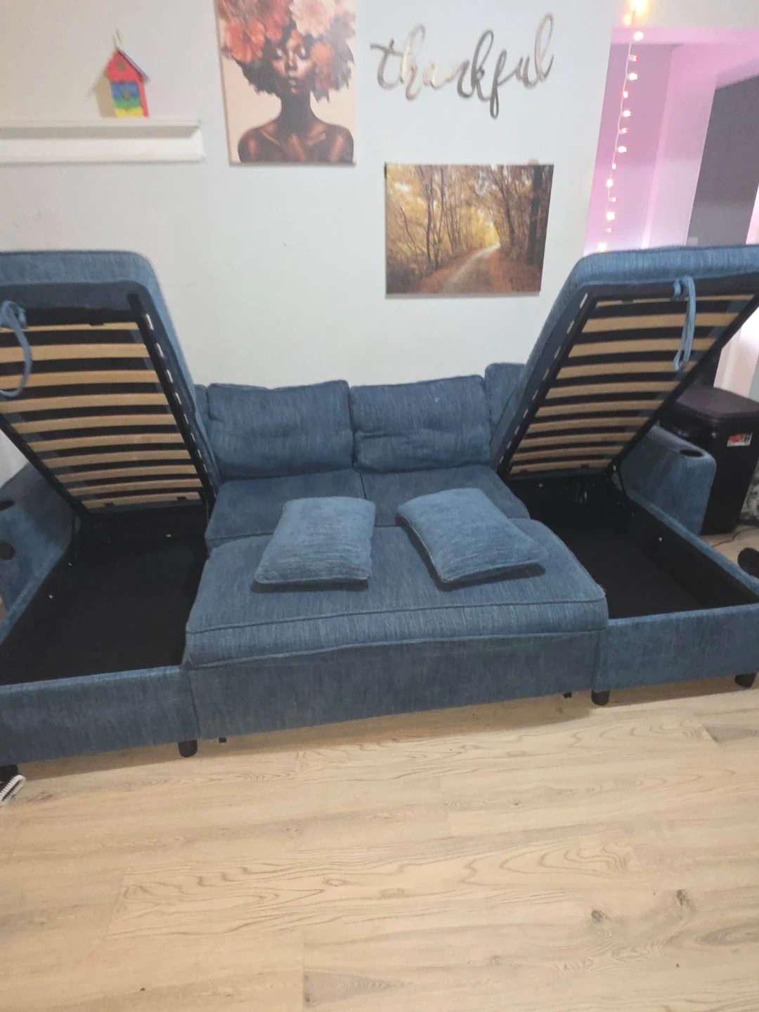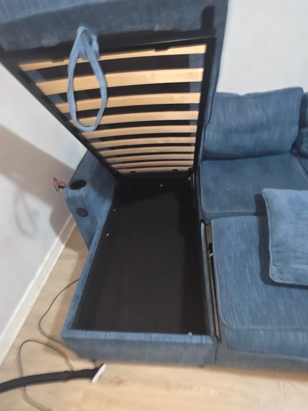 Blue upholstered sectional & convertible bed sofa. Features built-in storage compartments and USB charging ports. Comfortable seating for multiple people. It's a versatile addition to any living space!