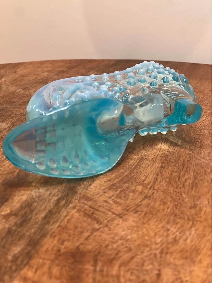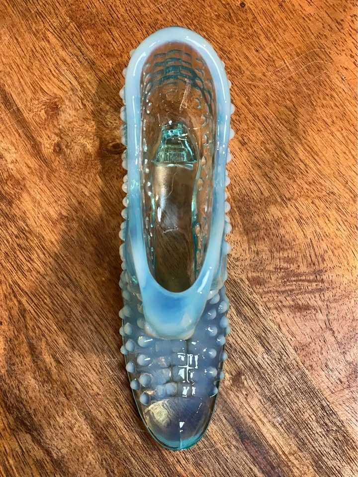 This is a unique Vintage Fenton Glass Hobnail Slipper, featuring a "Cat Head" or "Kitten" design where the shoe's laces would be. The glass has a hobnail (raised bumpy texture) pattern and is opalescent in an aqua, turquoise, or light blue shade. This mid-century piece was likely made between the 1950s and 1970s. It measures approximately 6 inches long and 3 inches tall. Preowned. Pickup is at 58th and 7th Ave in Midtown Manhattan.
