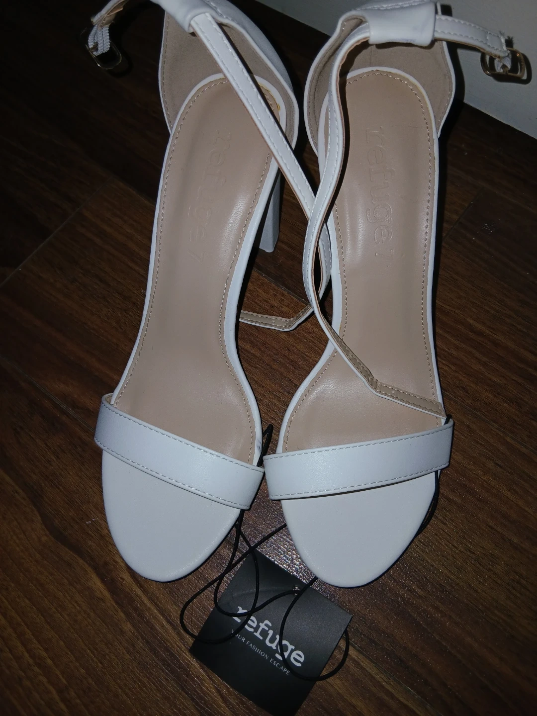 These white block heel sandals from Refuge are stylish and versatile. They feature an ankle strap with a buckle closure.