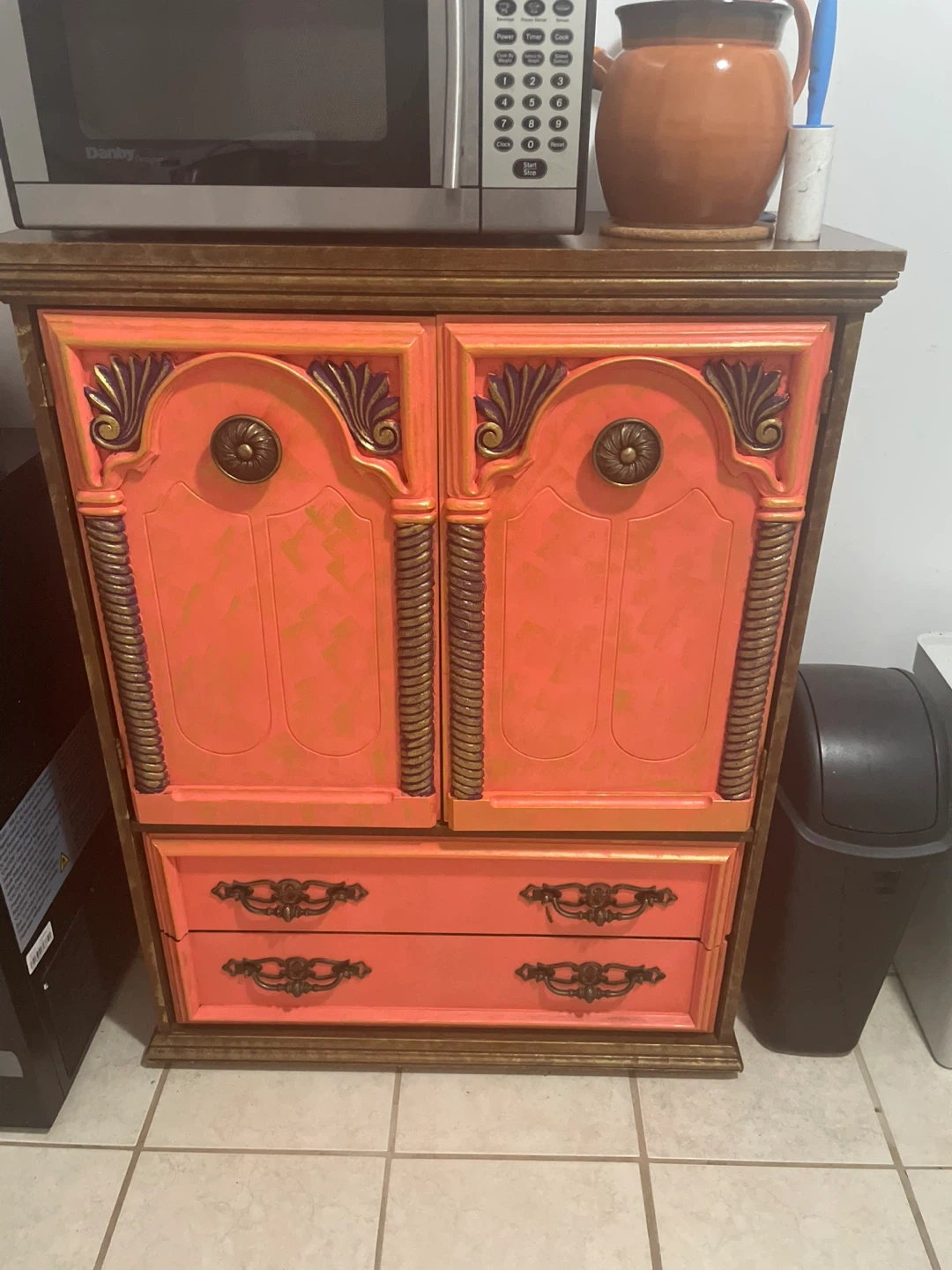This is a unique, hand-painted armoire featuring two doors and two drawers.