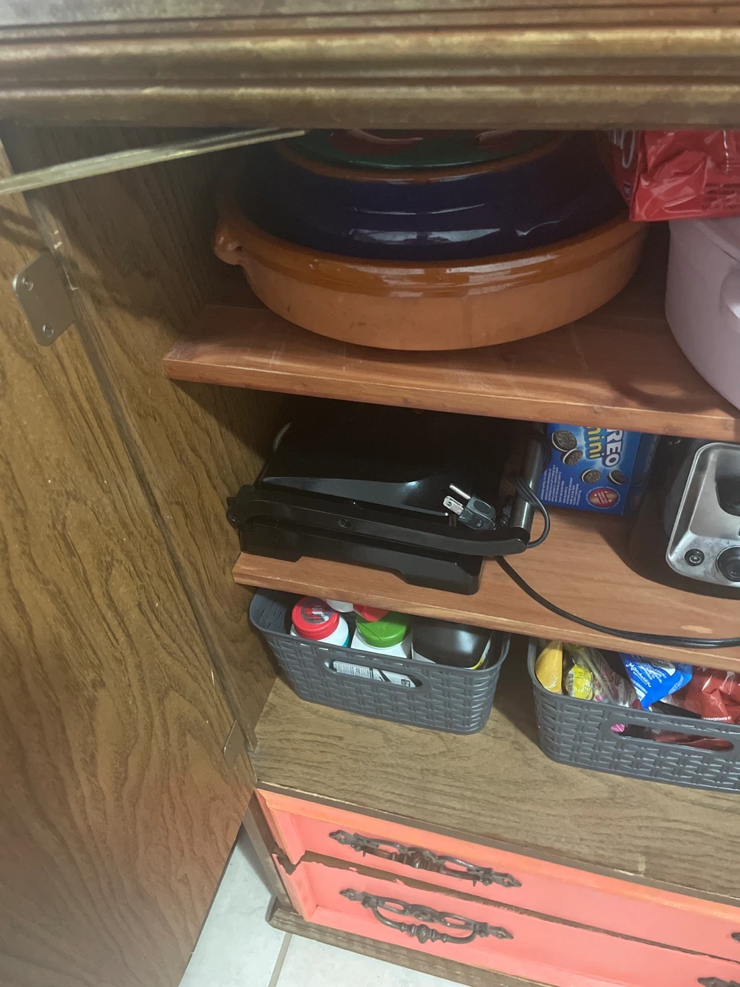 The exterior is finished in a vibrant coral with gold accents, and the interior shelving is wood.
