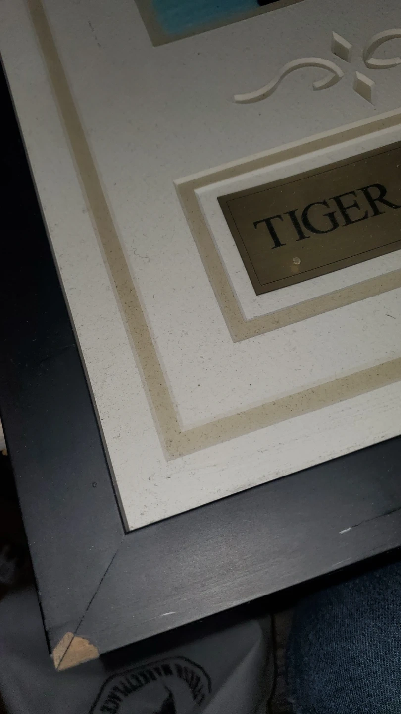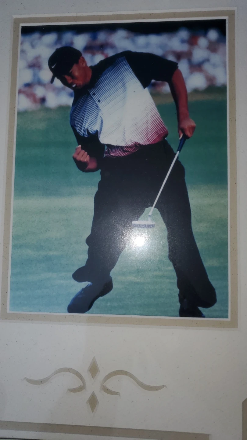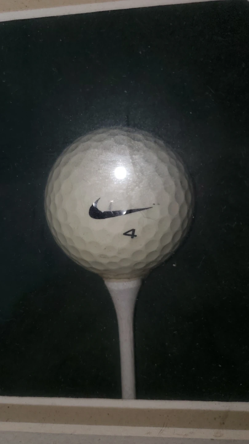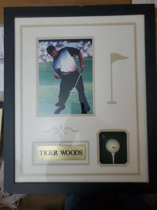 Framed collectible featuring Tiger Woods celebrating a win. Includes a Nike golf ball with the "4" marking. Great piece for any golf enthusiast! Frame has minor chips, see photos