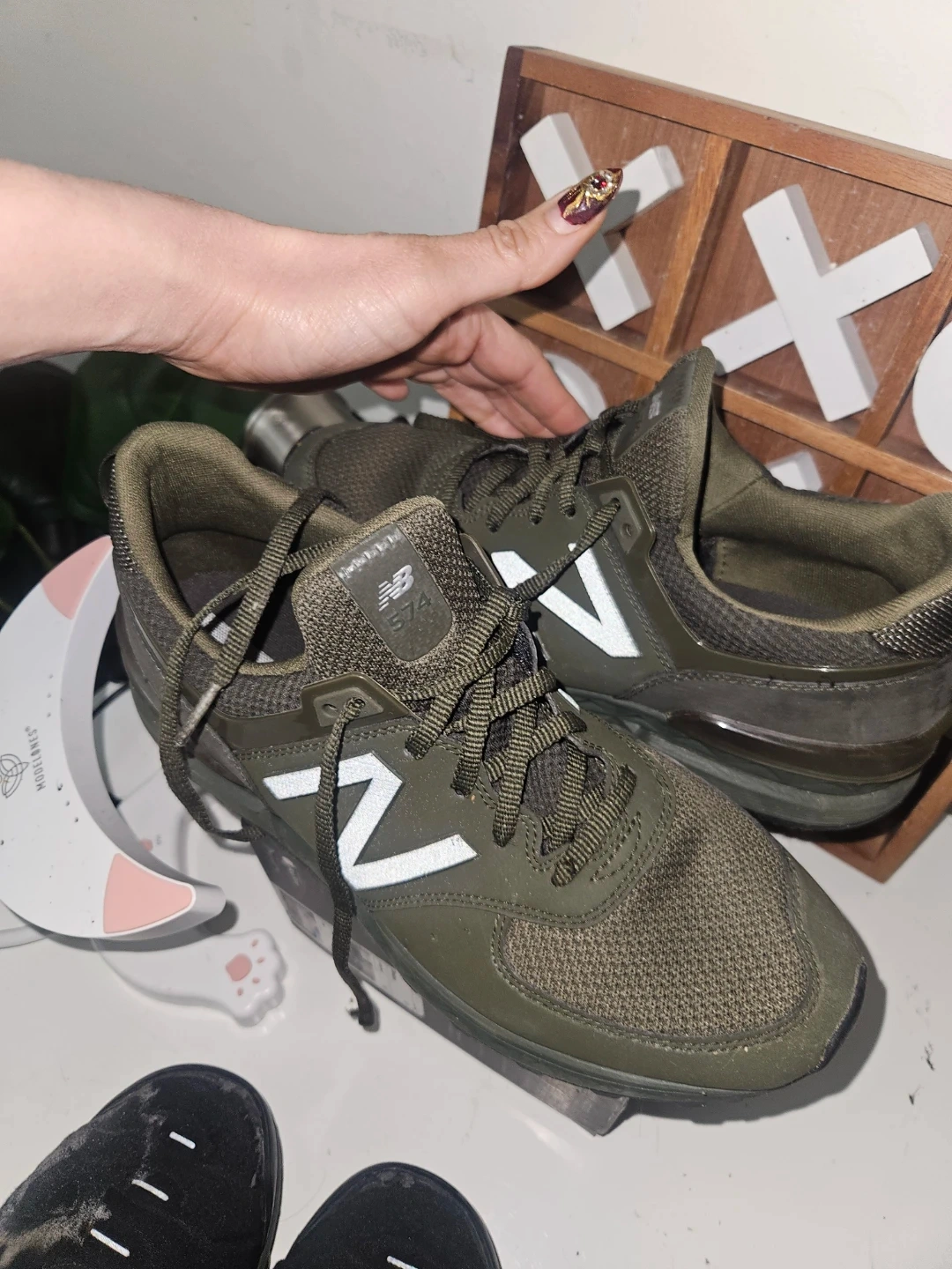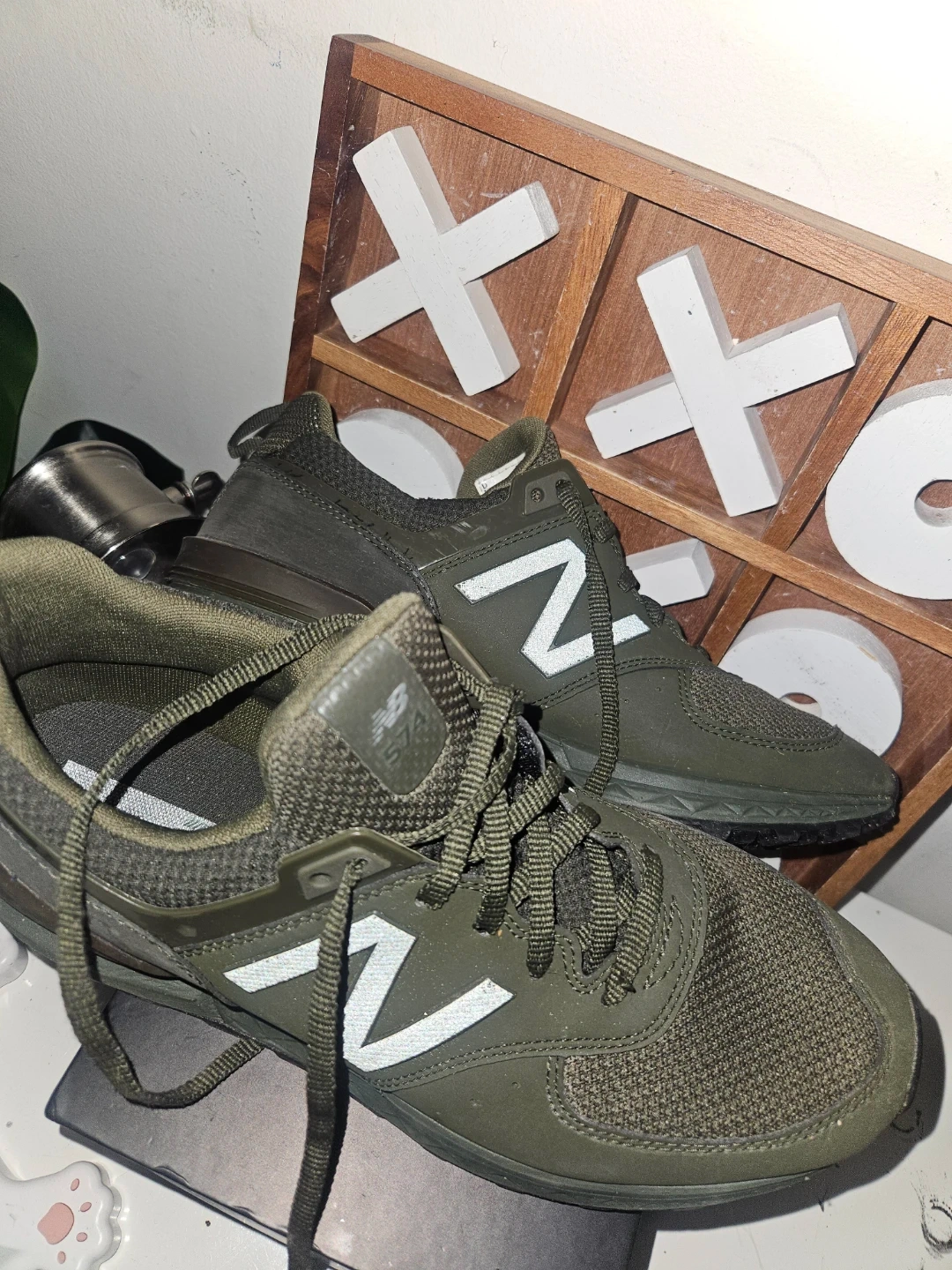 New Balance 574 sneakers in an olive green color. Mesh and synthetic upper. Rubber sole for traction. Classic "N" logo on the sides. These shoes offer comfortable everyday wear.