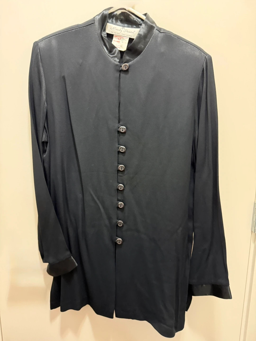 This is a two piece black button-up long blouse with matching pants by Randy Pa--tel. It features a satin collar and cuffs. It's a great layering piece for many occasions!