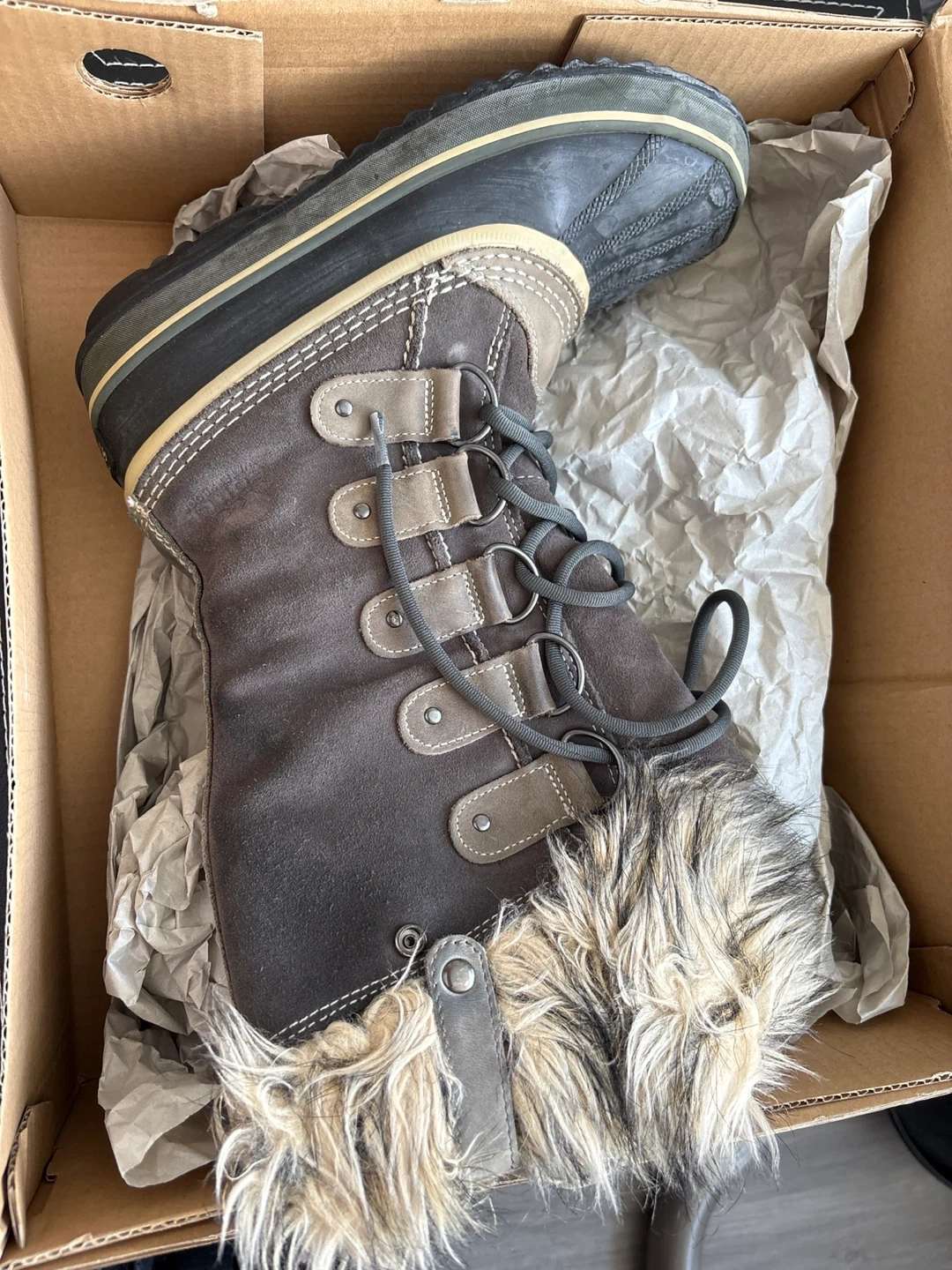 These Sorel boots are designed for winter weather and are waterproof. They feature a comfortable fur lining for extra warmth. Comes with the original box.