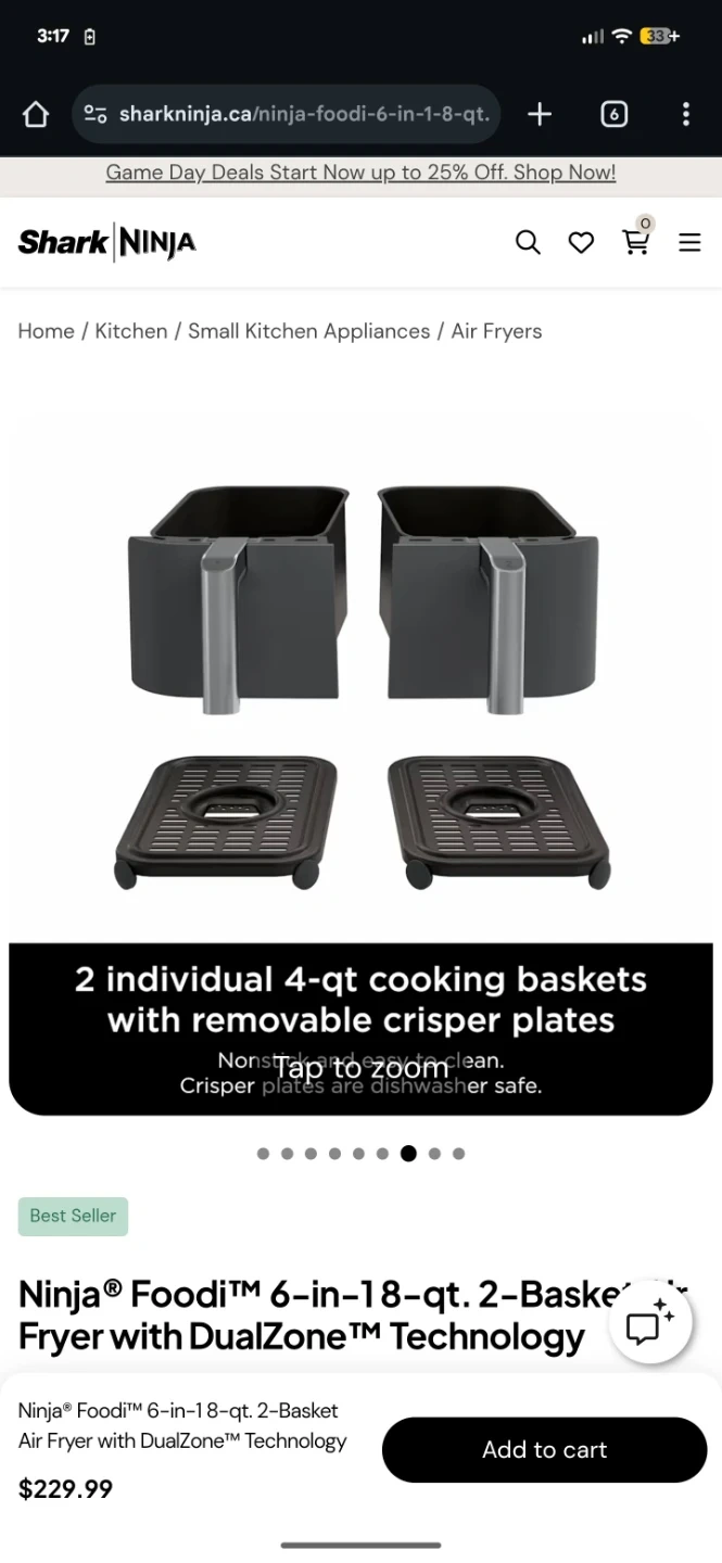 This Ninja Foodi air fryer has two individual 4-qt. cooking baskets with removable crisper plates. It offers 6 cooking functions and DualZone technology for cooking different foods at different temperatures. The baskets and crisper plates are dishwasher safe for easy cleanup.