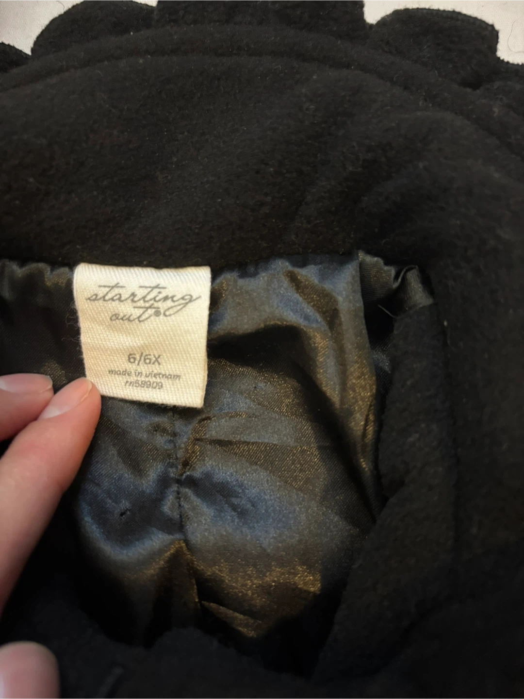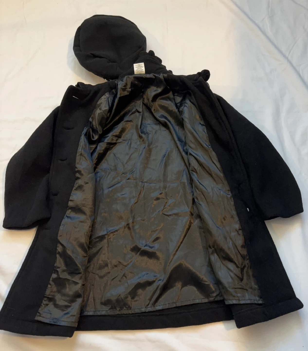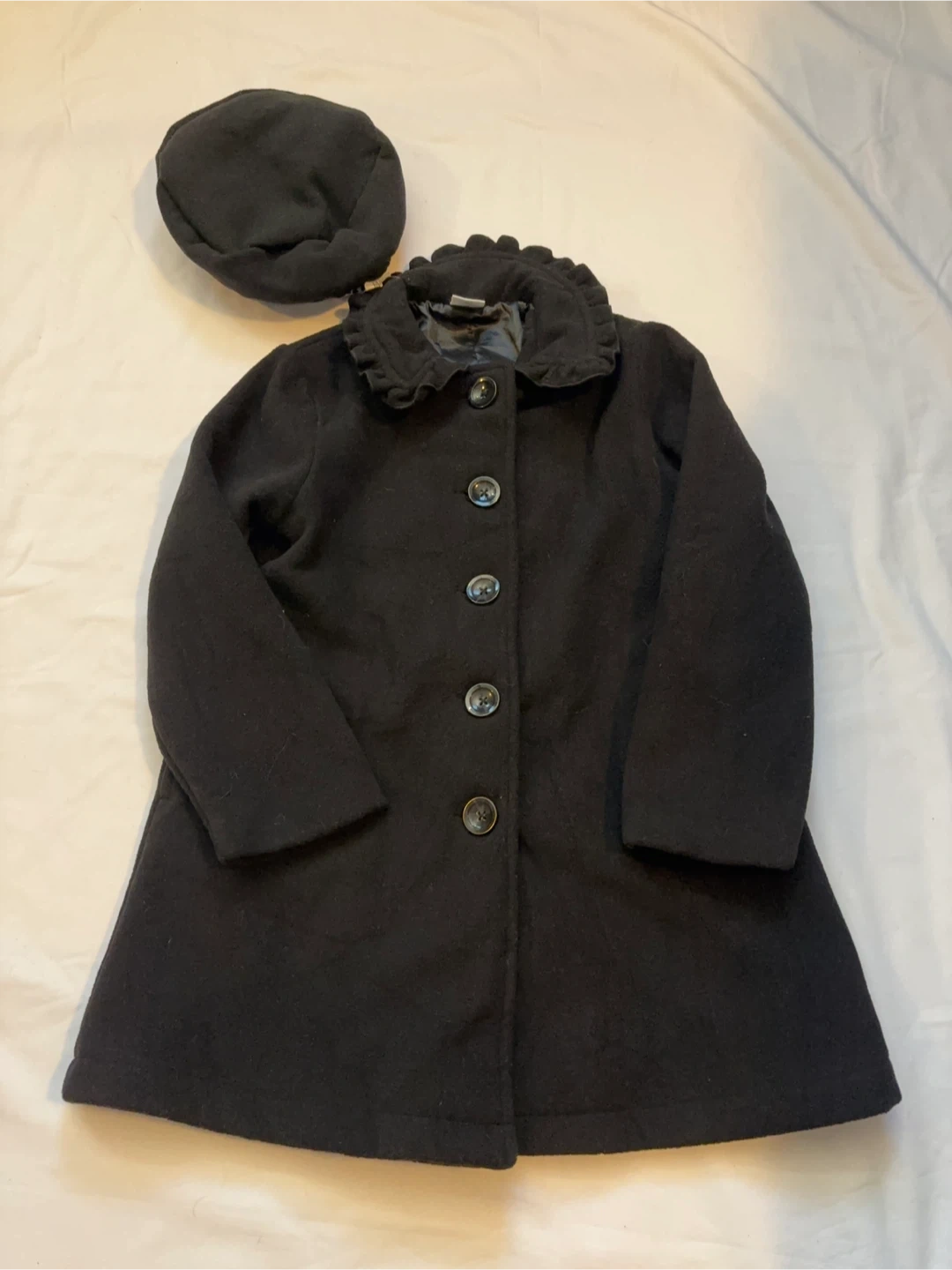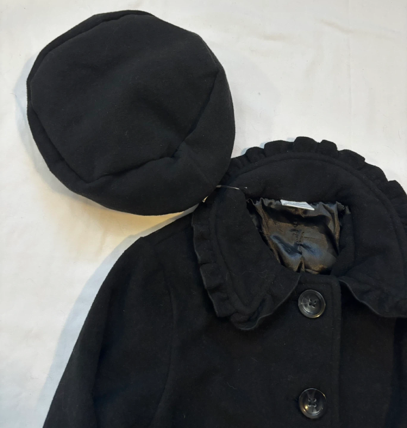 Black outer fabric with a matching hat. Button-front closure and classic silhouette. Simple, versatile style for everyday wear. $15 cash, porch pick up Kennedy and Eglinton.