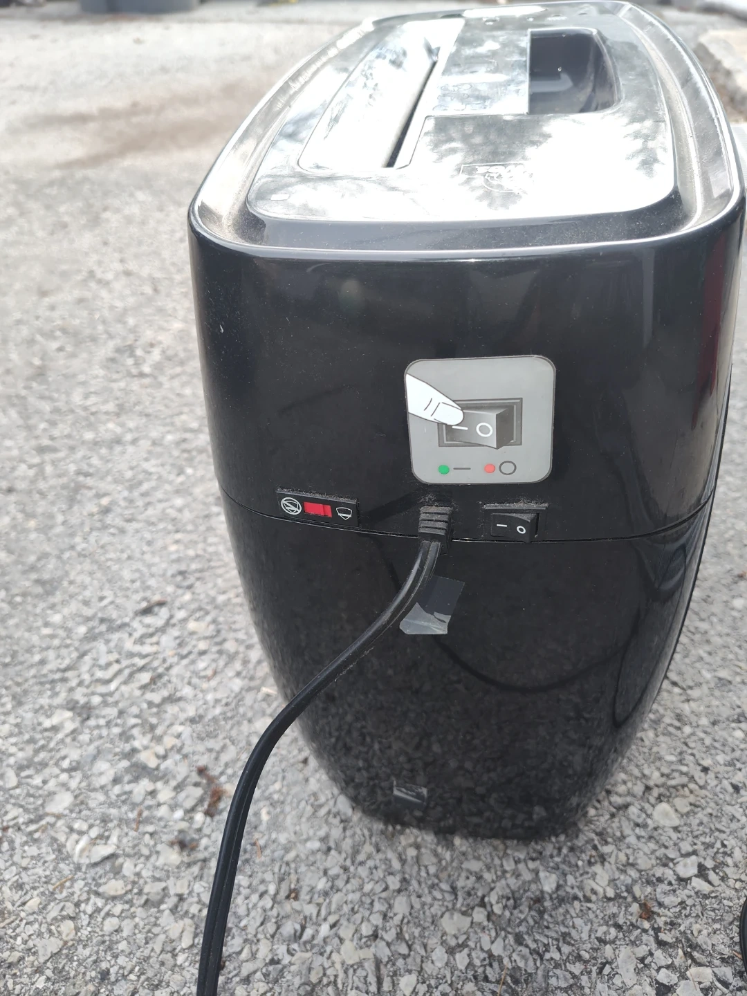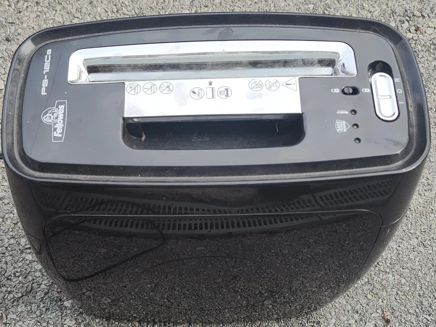This is a black Fellowes PS-12Cs shredder. It's designed for home or office use. It features a compact design and a power switch with indicator lights.