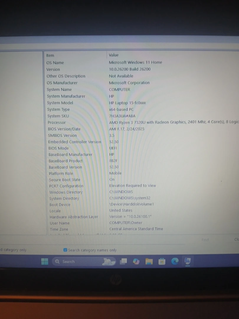 This HP Laptop features an AMD Ryzen 3 7320U processor with Radeon Graphics and 8GB of RAM. It's running Microsoft Windows 11 Home. Total physical memory is 7.24 GB.