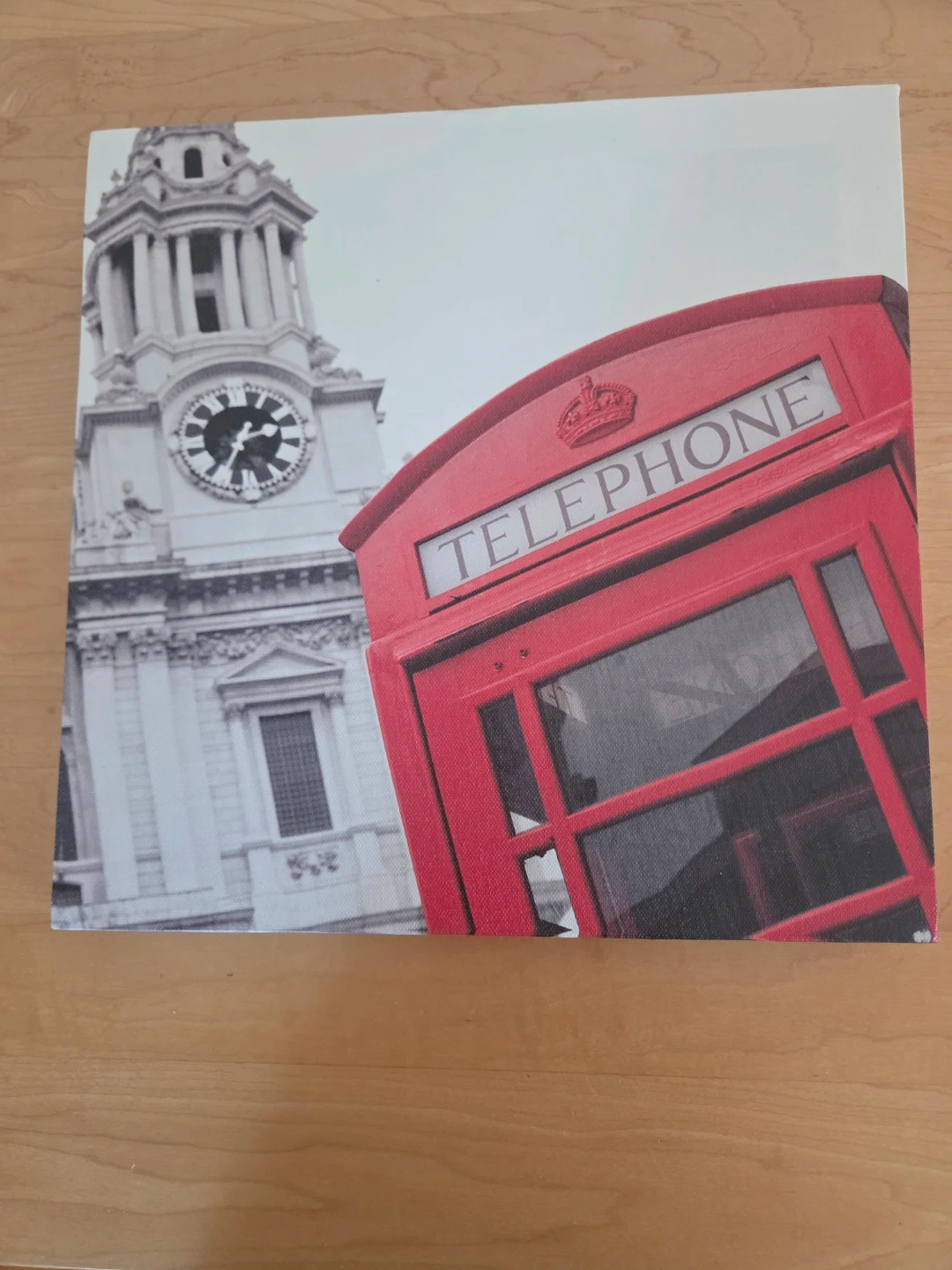 This canvas wall art features a classic London scene with a red telephone booth and a prominent clock tower. It's printed on canvas, ready to hang. A nice decorative piece for any room!