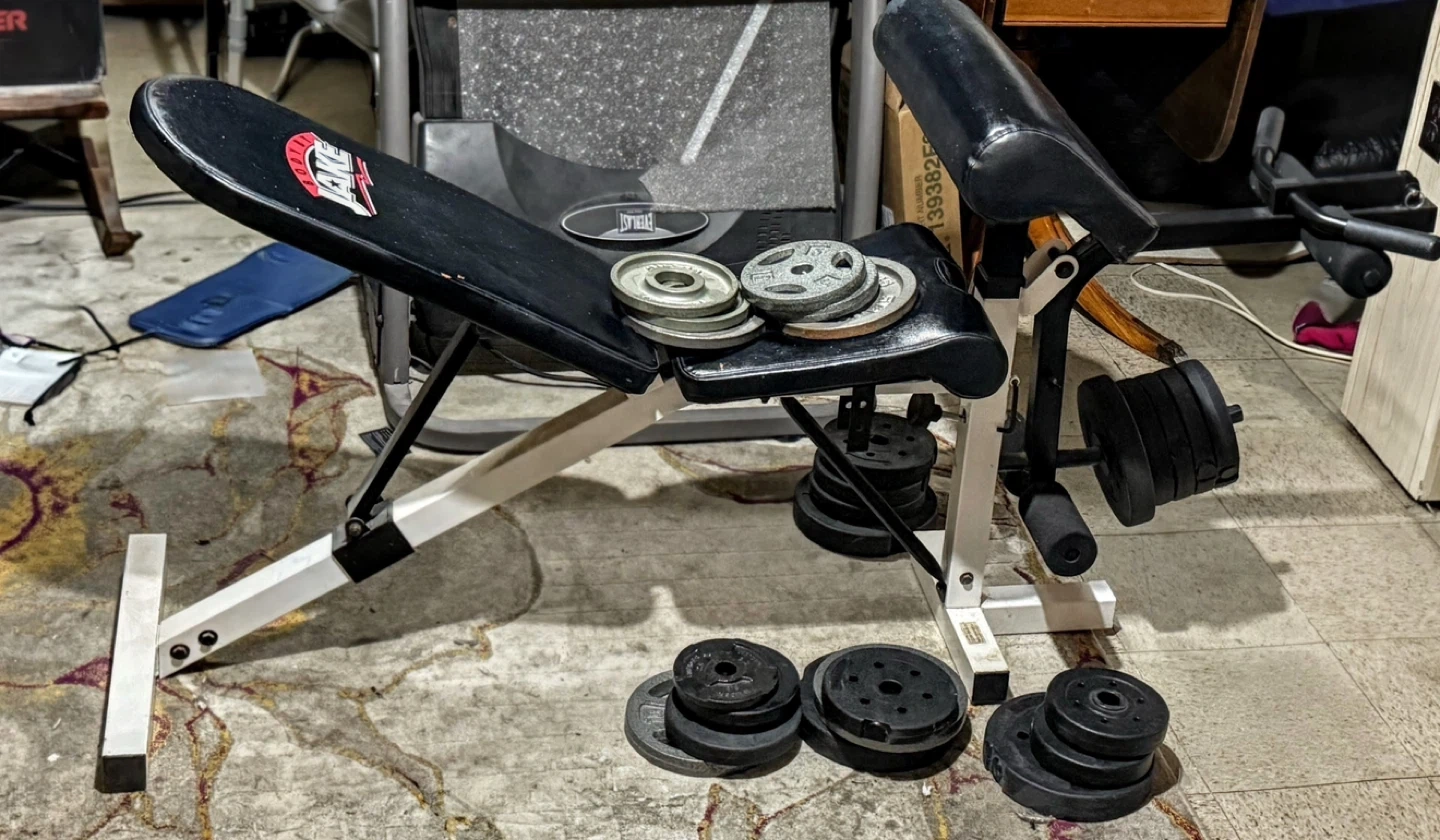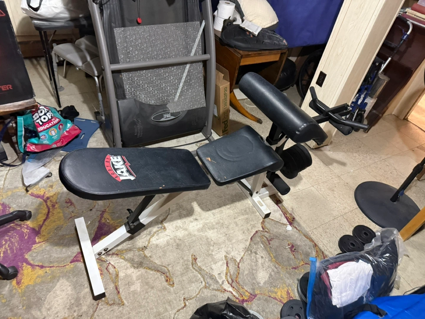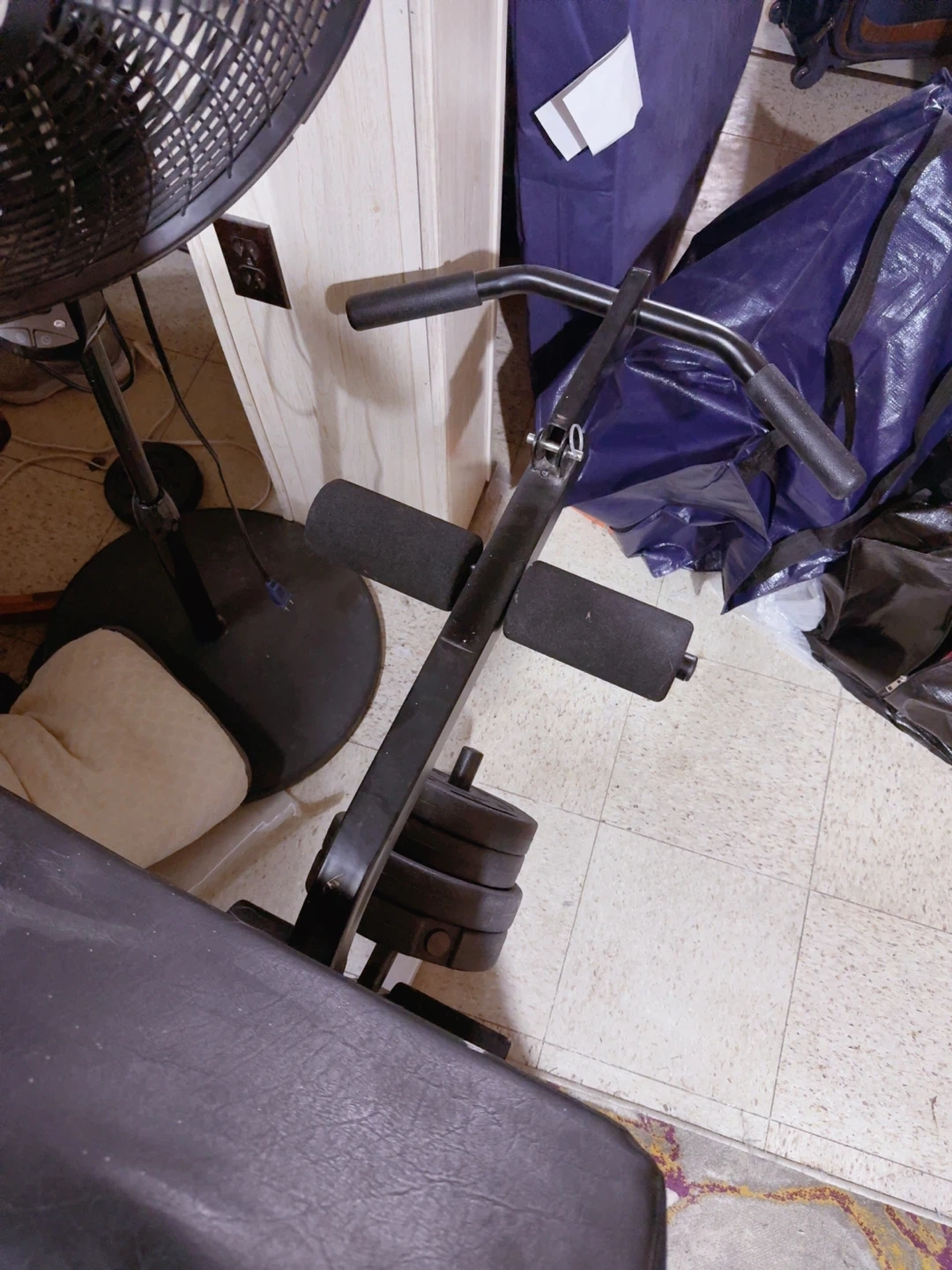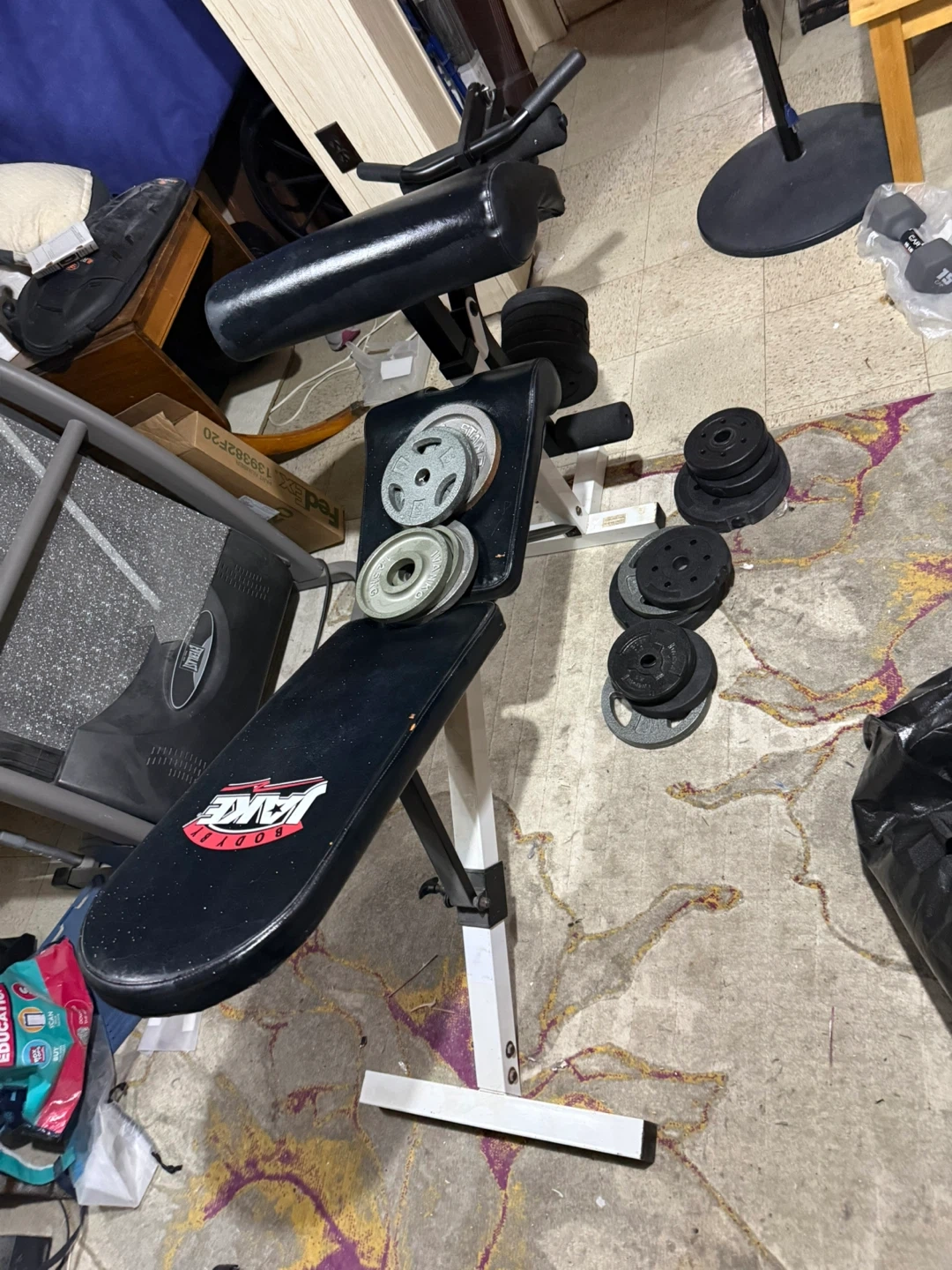 Hey, selling a super versatile weight bench with adjustable backrest and leg curl/extension attachment - it's a total gym in one! Comes with a bunch of weight plates about 20 plates that are between 10, 5 and 2.5 pounds that makes up to be over 200lbs of plates alone.
