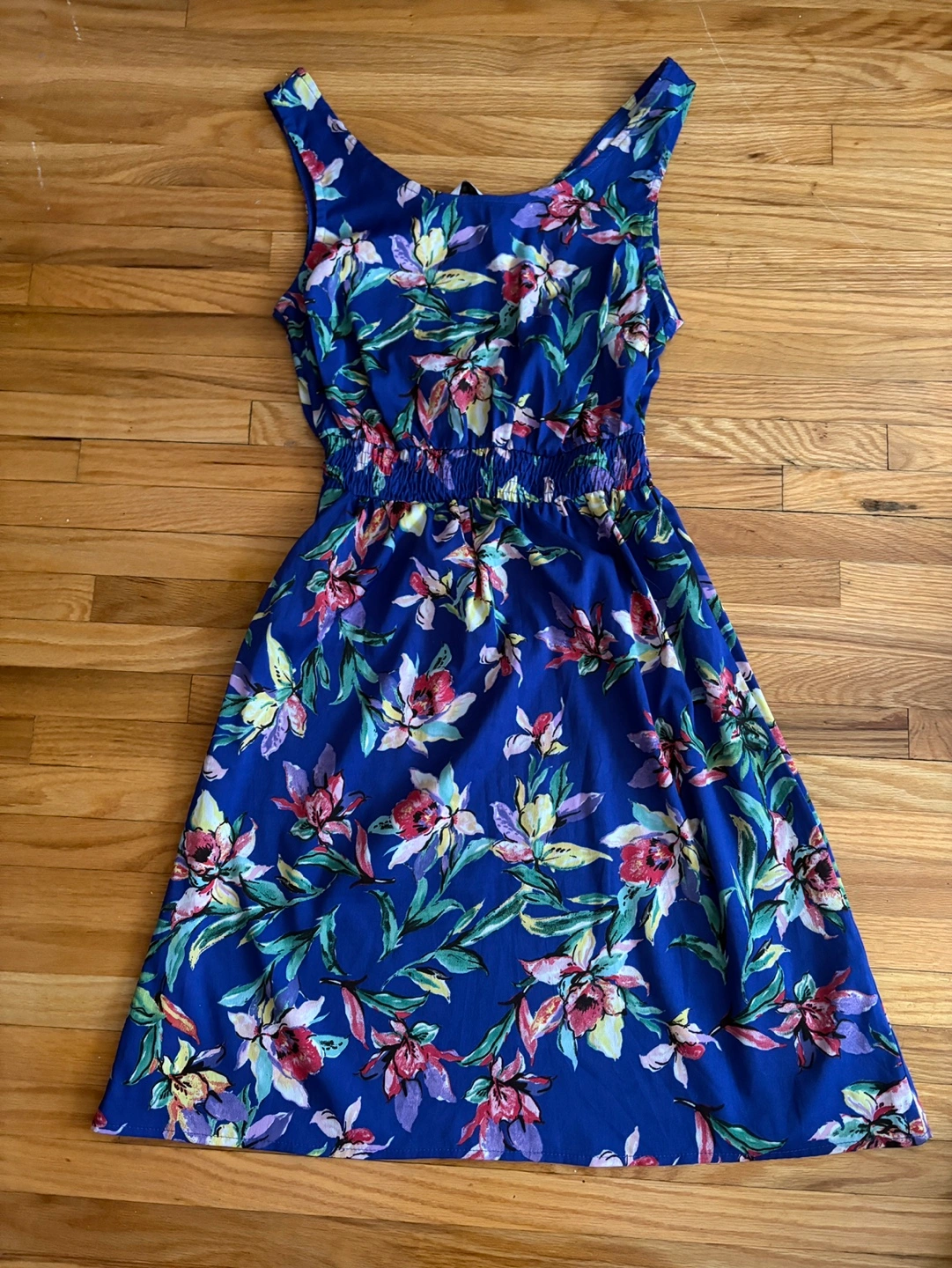 Beautiful sleeveless midi dress. Features a vibrant floral print on a blue background. Elastic waistband. Perfect for summer.