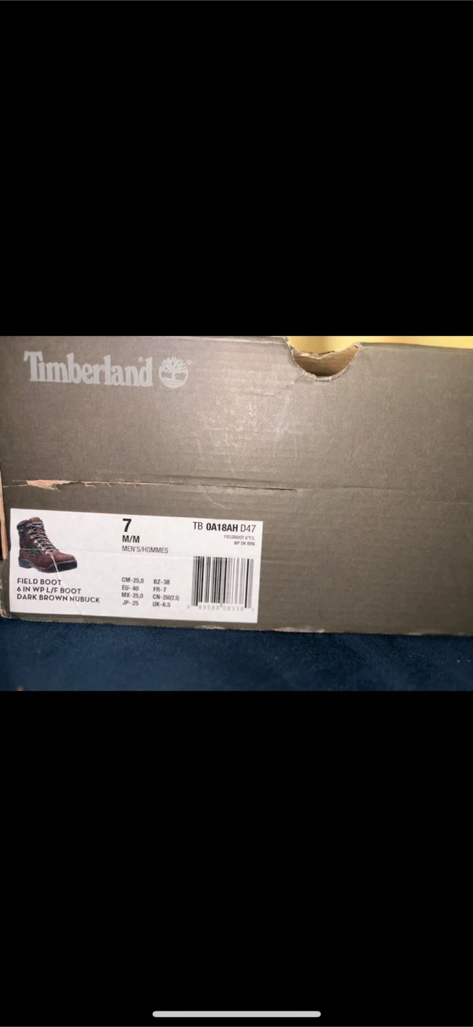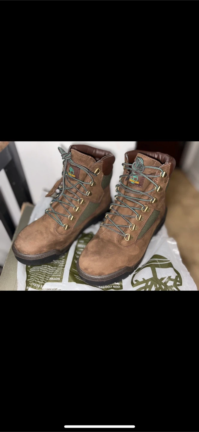 Selling a pair of Timberland Field Boots in size 7. They are a dark brown nubuck color with green accents. These are guaranteed waterproof since 1973! Comes with the original box