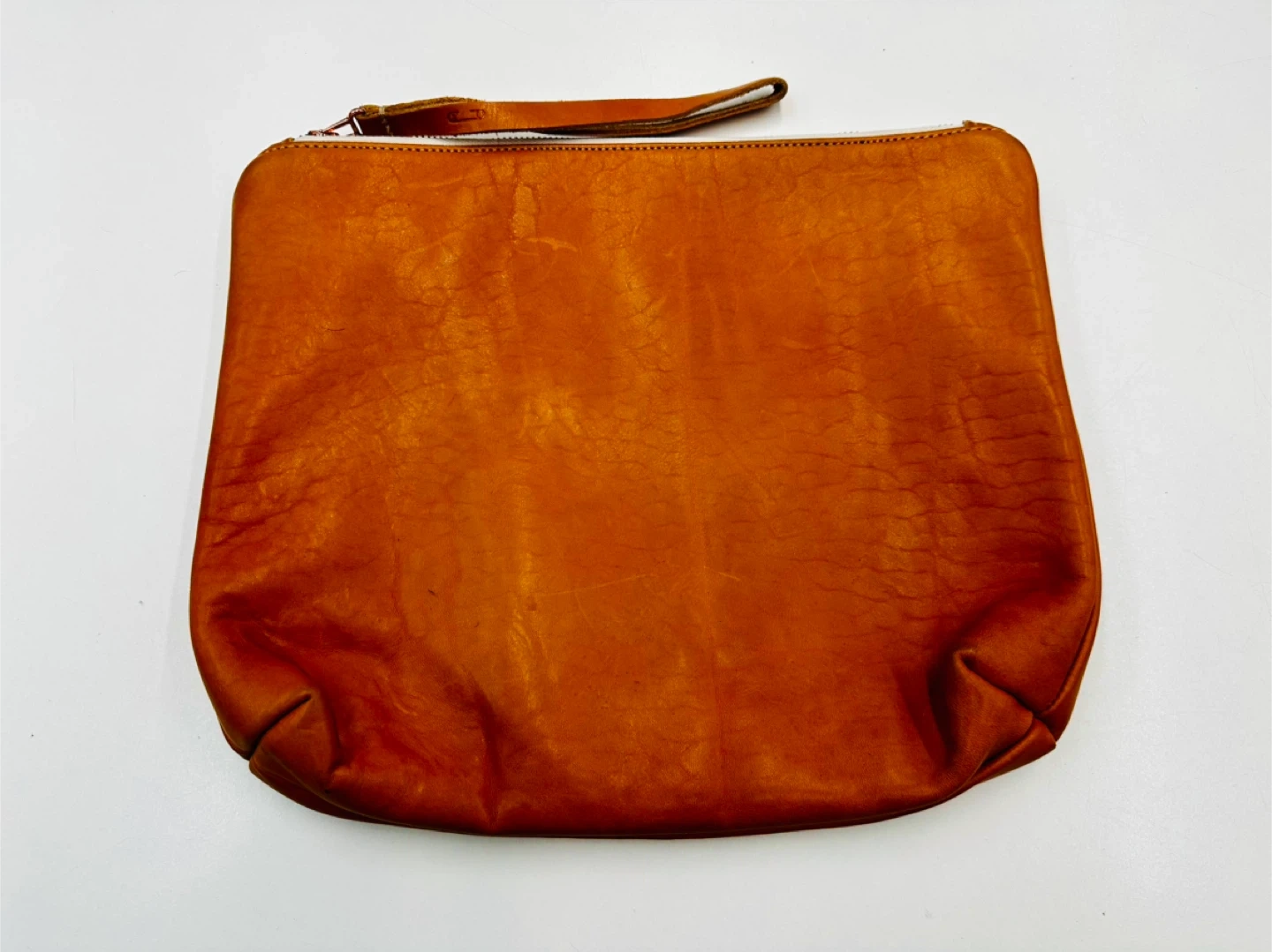 This is a genuine leather clutch bag with a zip closure and wrist strap. The interior lining is a water-resistant material. It's a versatile accessory for organizing essentials. Optional baby changing pad. 😉 made in nyc