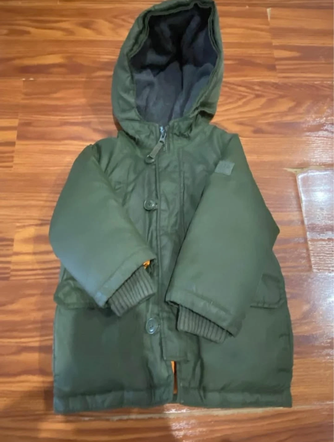 This Gap snorkel parka is designed for warmth. It features a full zip front with button closures and four front pockets. The hood is lined for extra coziness. It's a durable and practical outerwear choice for kids. Size 18-24 months