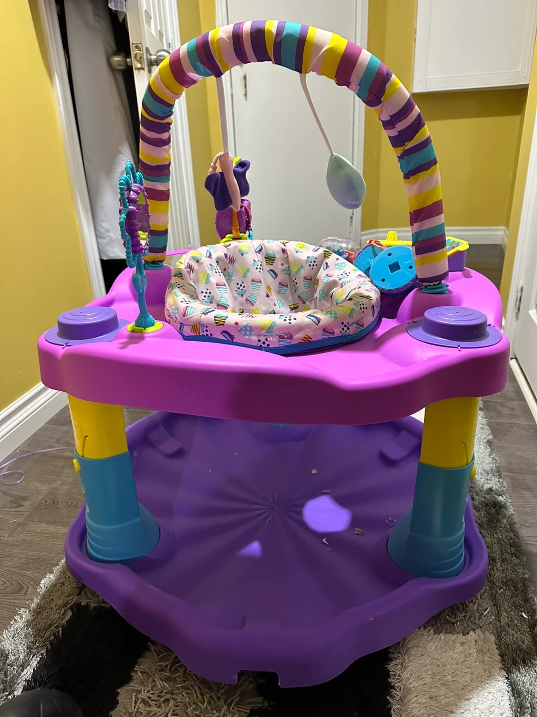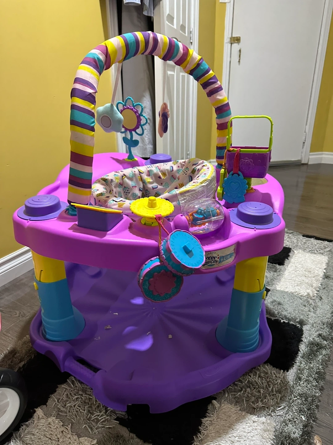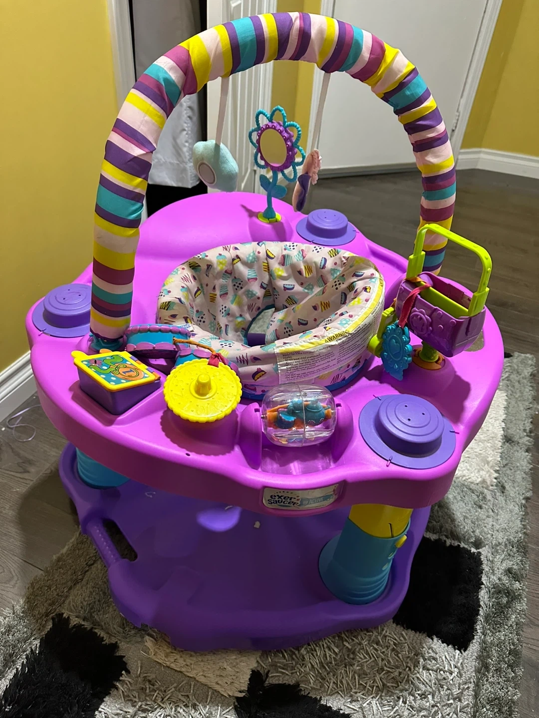 This Fisher-Price Jumperoo is designed for baby's entertainment and development. It features colourful toys and spins around for interactive play. It's great for keeping little ones engaged and active!
