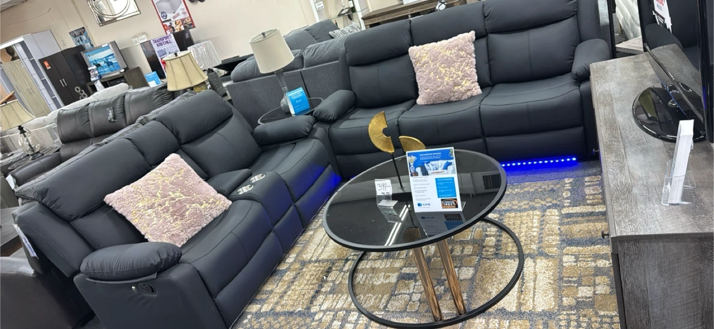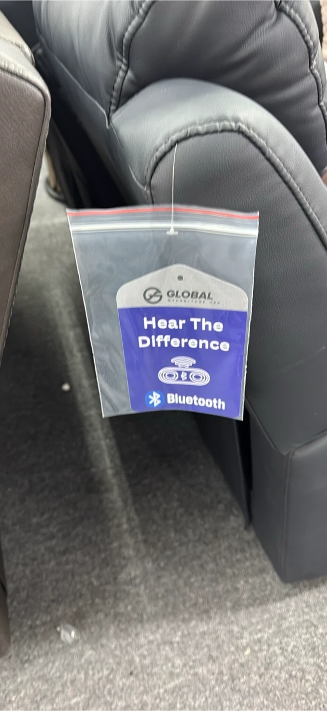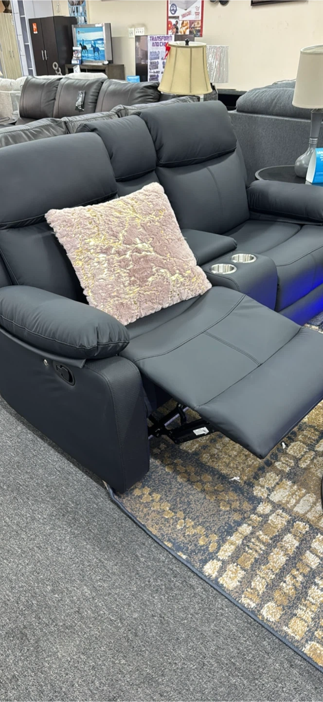 Black reclining sofa and loveseat. It's made with a durable material and includes cup holders. Features built-in Bluetooth audio for an enhanced experience!