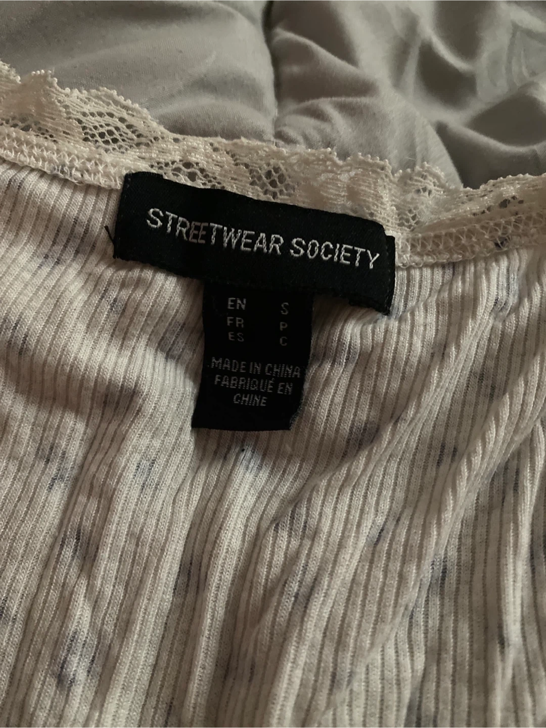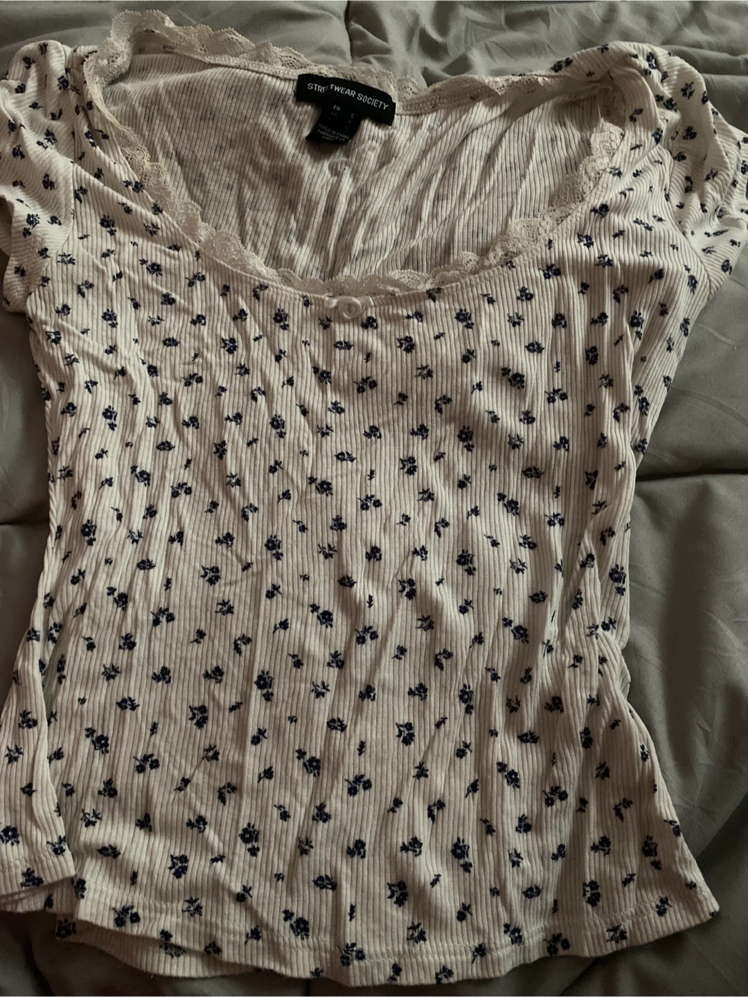 This white ribbed t-shirt features a dainty navy blue floral pattern. It has a delicate lace trim along the neckline and sleeve cuffs. It's a size small.