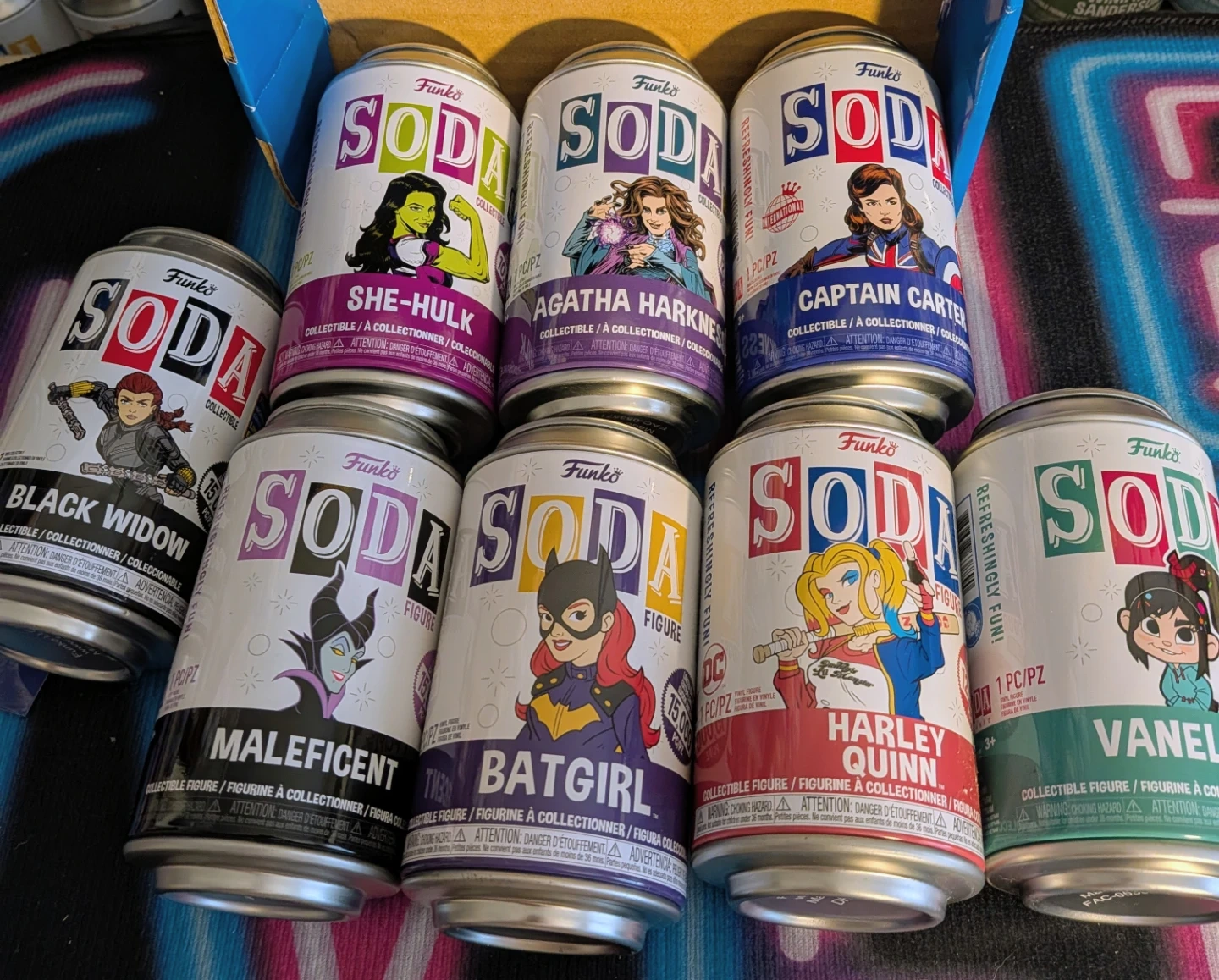 Set of Funko Soda collectible figures including She-Hulk, Agatha Harkness, Captain Carter, Black Widow, Maleficent, Batgirl, Harley Quinn, and Vanellope. These are vinyl figures. Cans are opened, all commons.