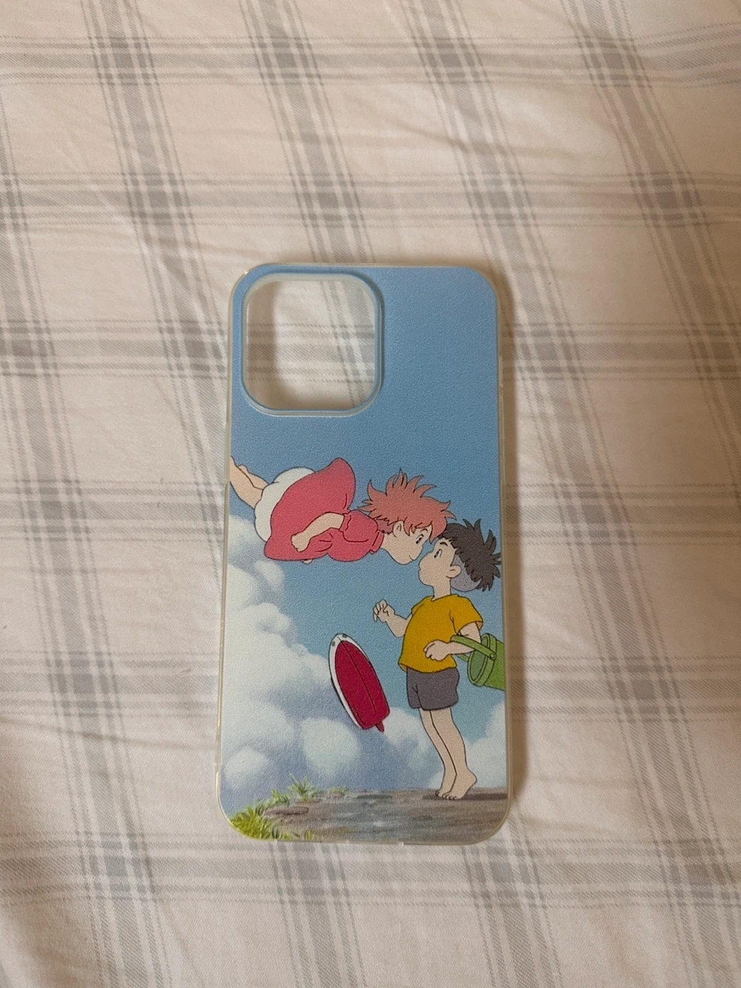 This is a phone case featuring characters from Studio Ghibli's Ponyo. It has a bright blue sky background with clouds, showing the characters Sosuke and Ponyo.