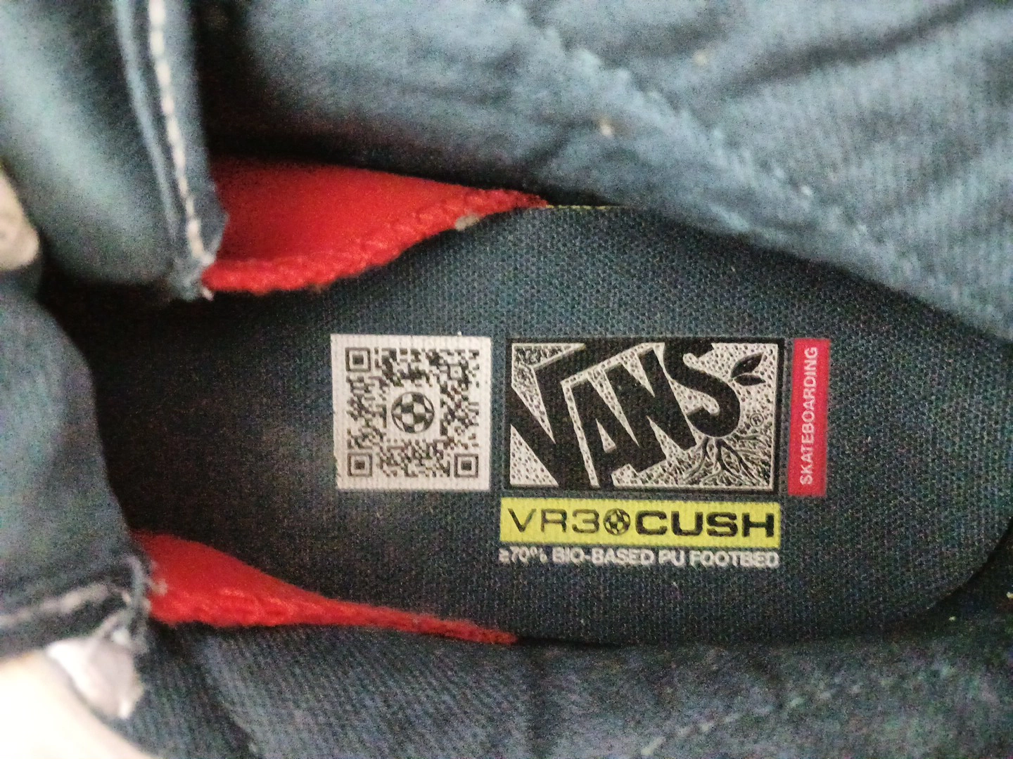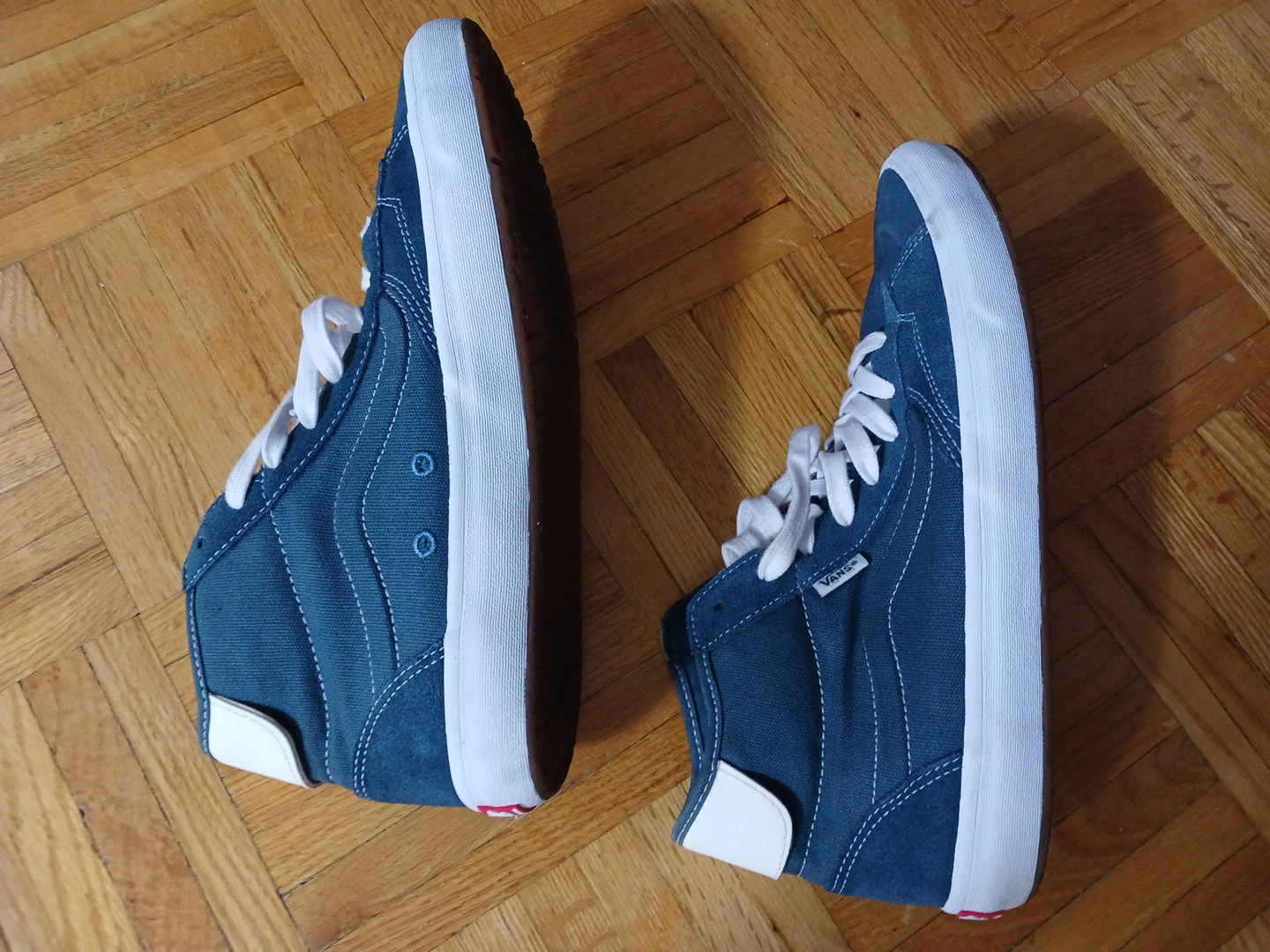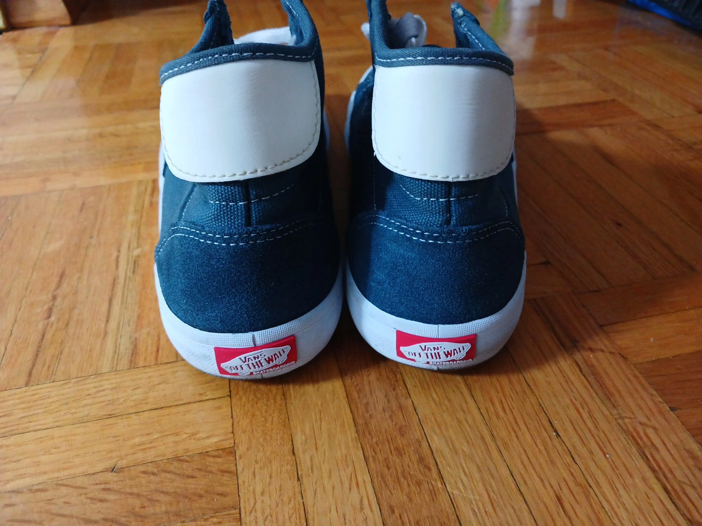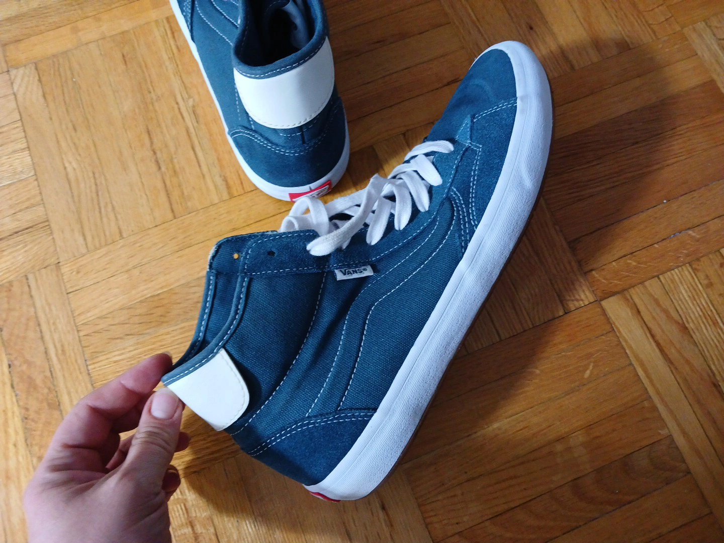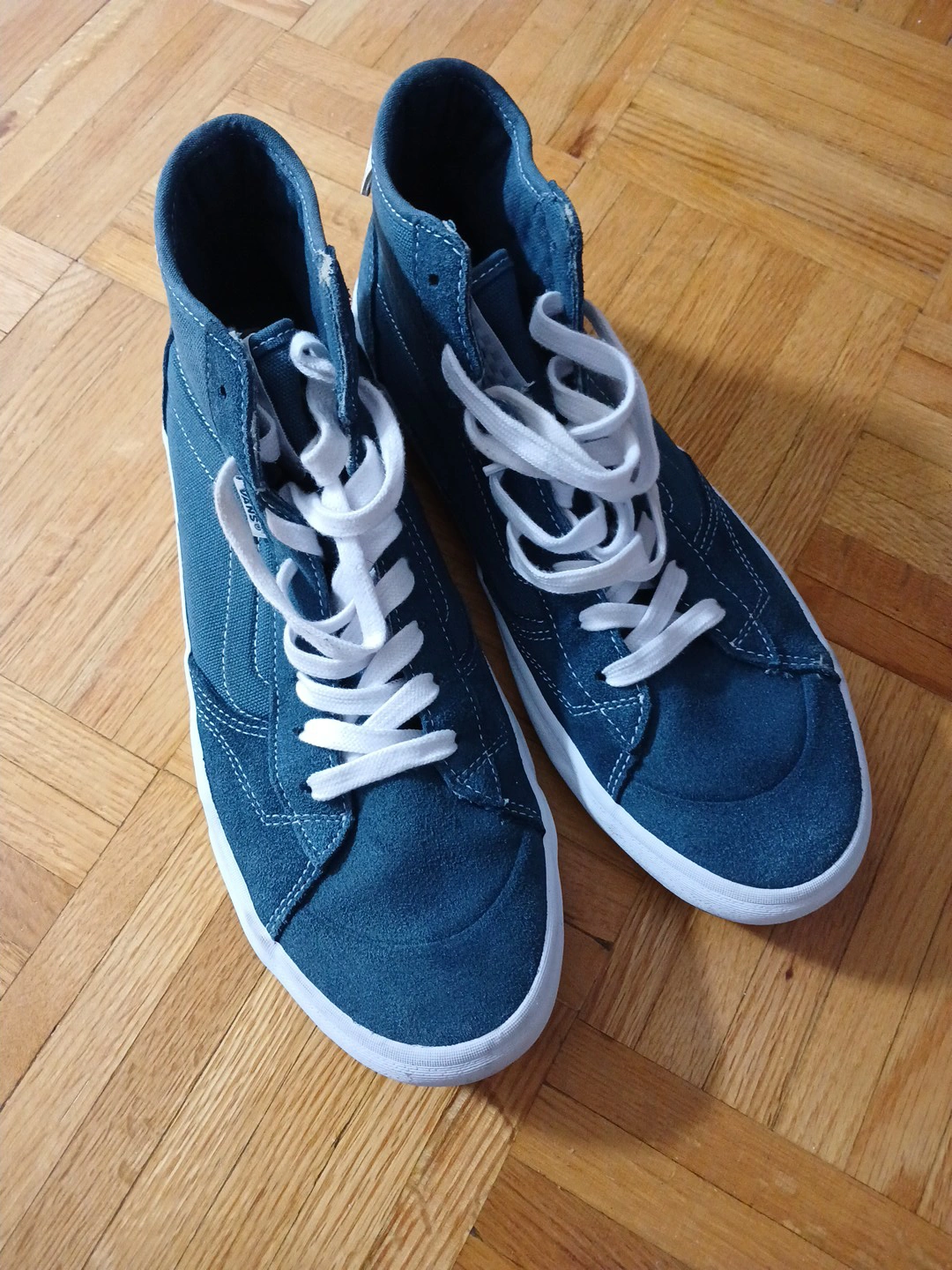 Teal high top Vans skateboard sneakers with white laces. The Lizzie shoe