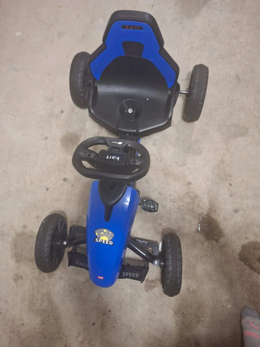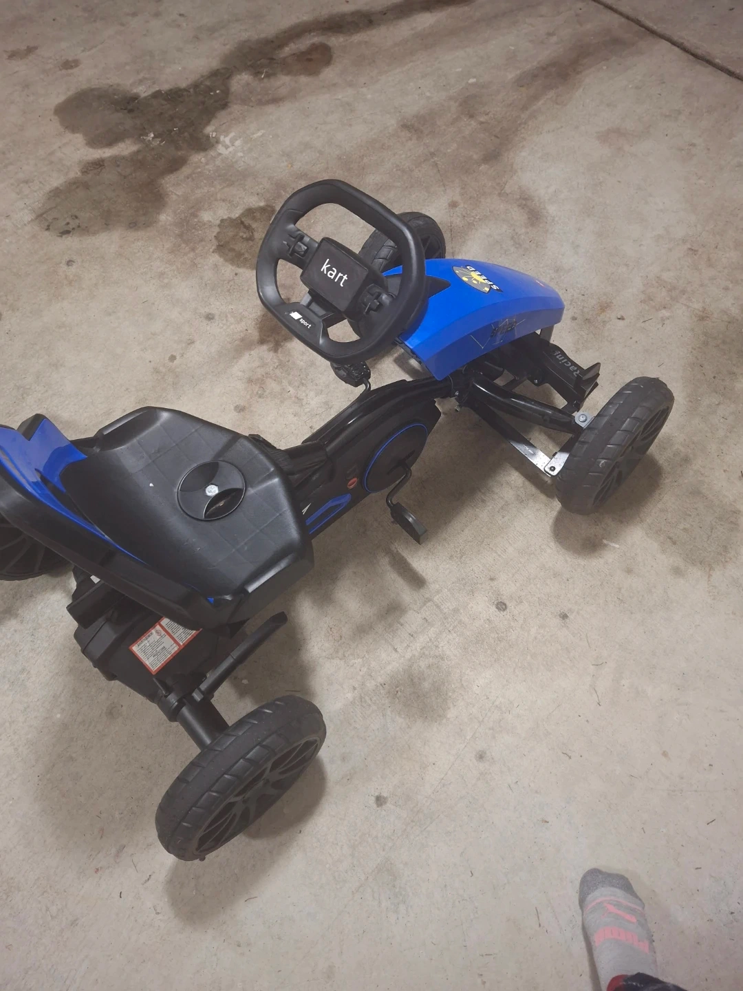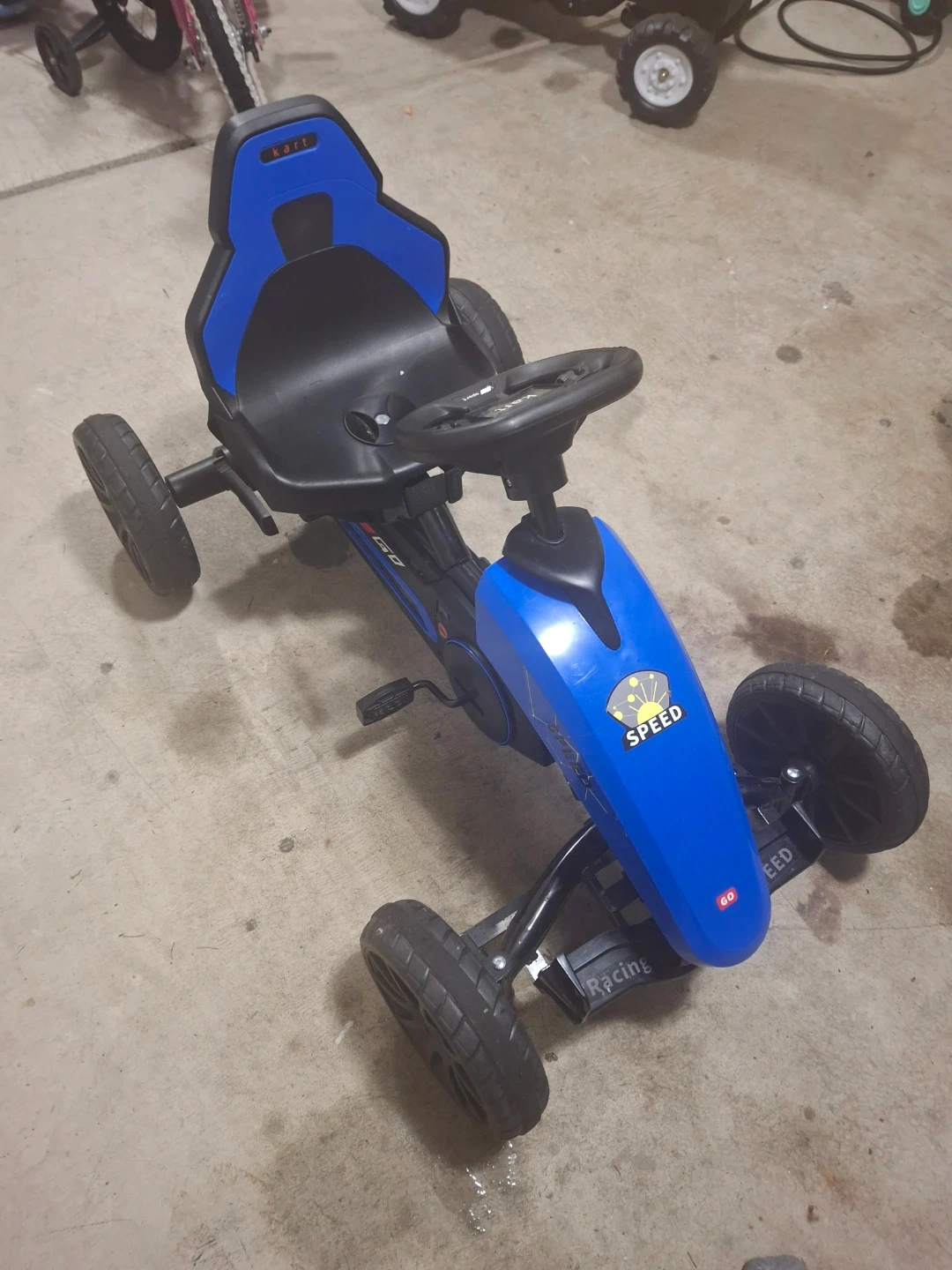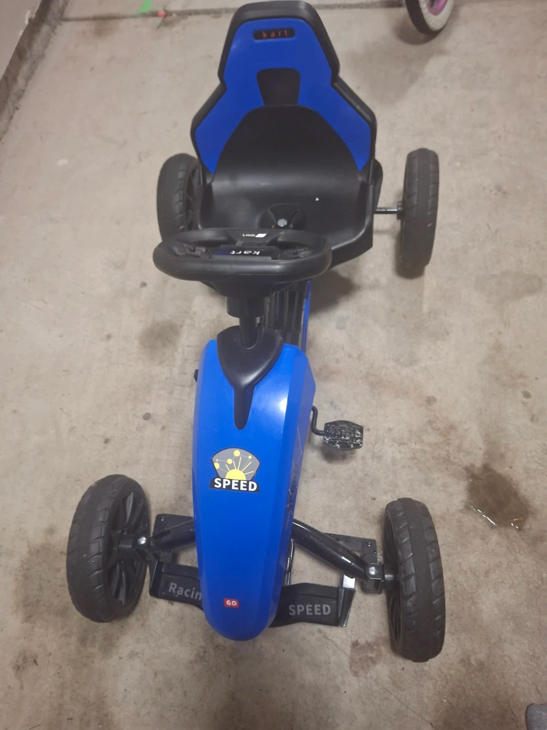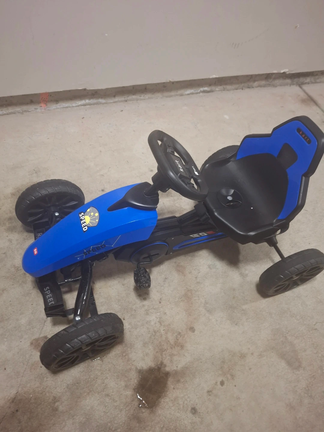 This blue pedal go car is designed for racing fun. It's got a sturdy frame and adjustable seat. Great for outdoor playtime for kids! Price is not negotiable