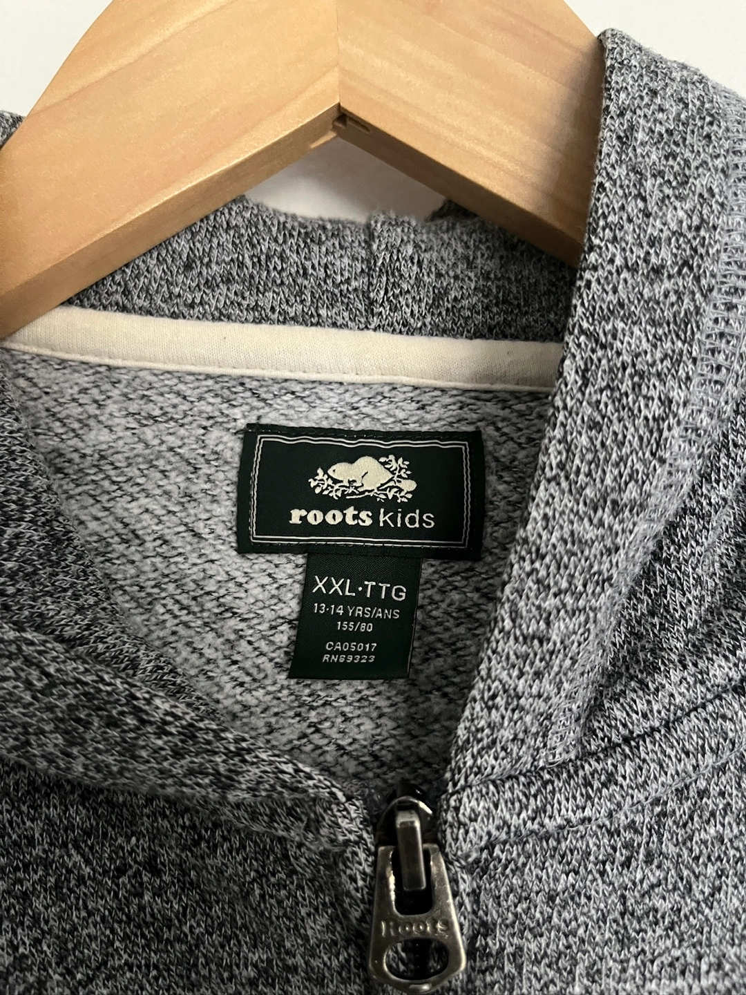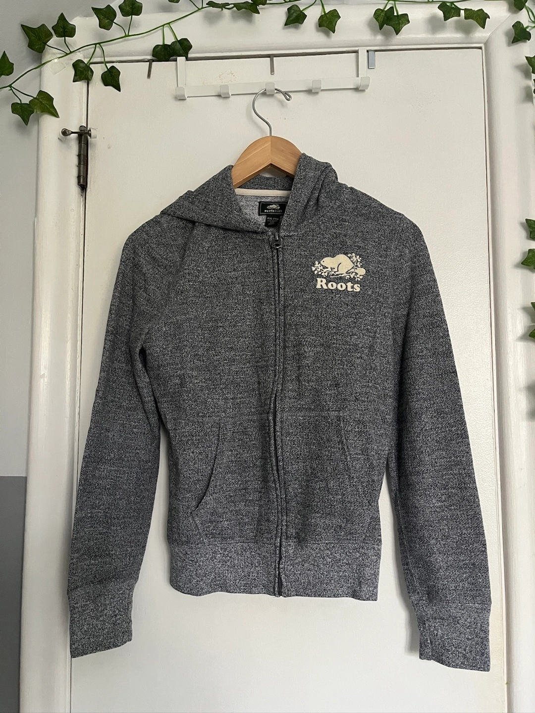 Selling a Roots Kids full zip hoodie in size XXL (13-14 years). Also fits womens XS. It's a cozy grey colour and features the classic Roots logo. Perfect for the cold season!