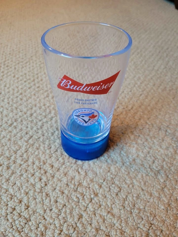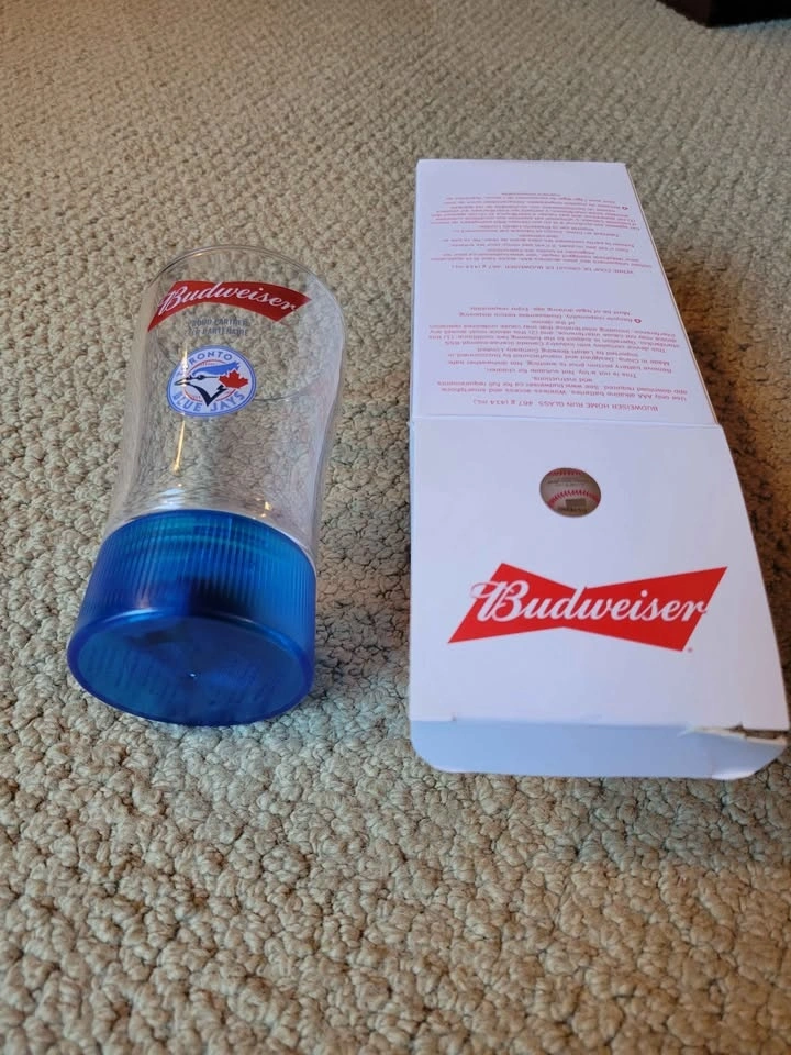 This unique, officially licensed MLB collectible is designed to enhance the game-day experience by lighting up when the Blue Jays hit a home run. It connects via Bluetooth to the "Budweiser Sports App" on a smartphone. When the app detects a home run by your synced team, the blue light in the removable base flashes. It requires 2 AAA batteries, which are not included.