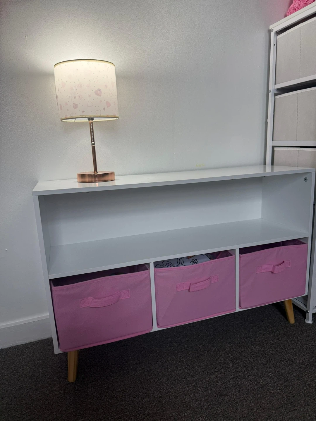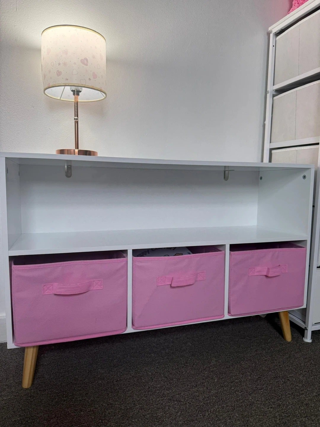 White storage unit with a shelf and three pink fabric bins. Made of particle board. Measures approximately 47" long, 16" deep, and 20" tall. Bins are collapsible.
