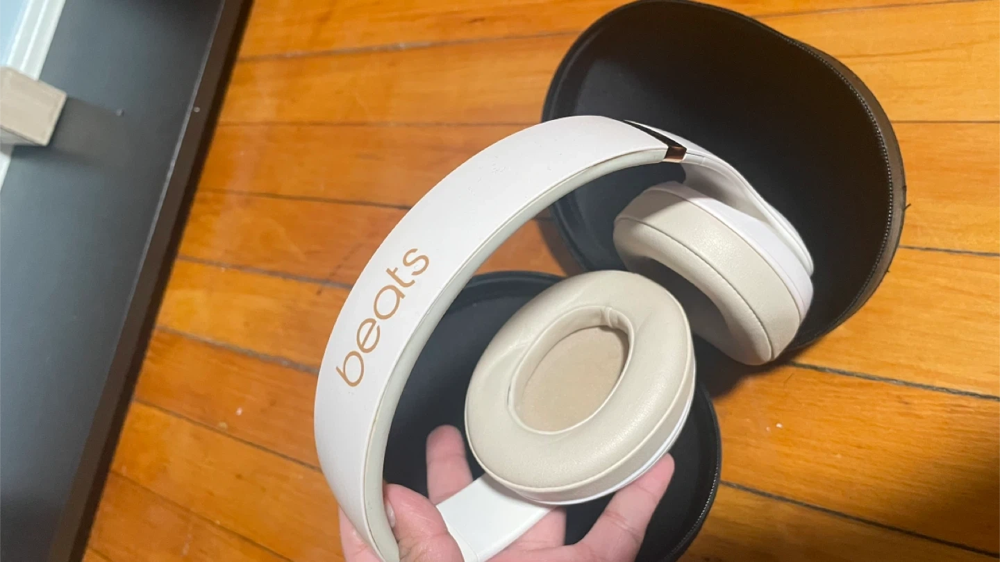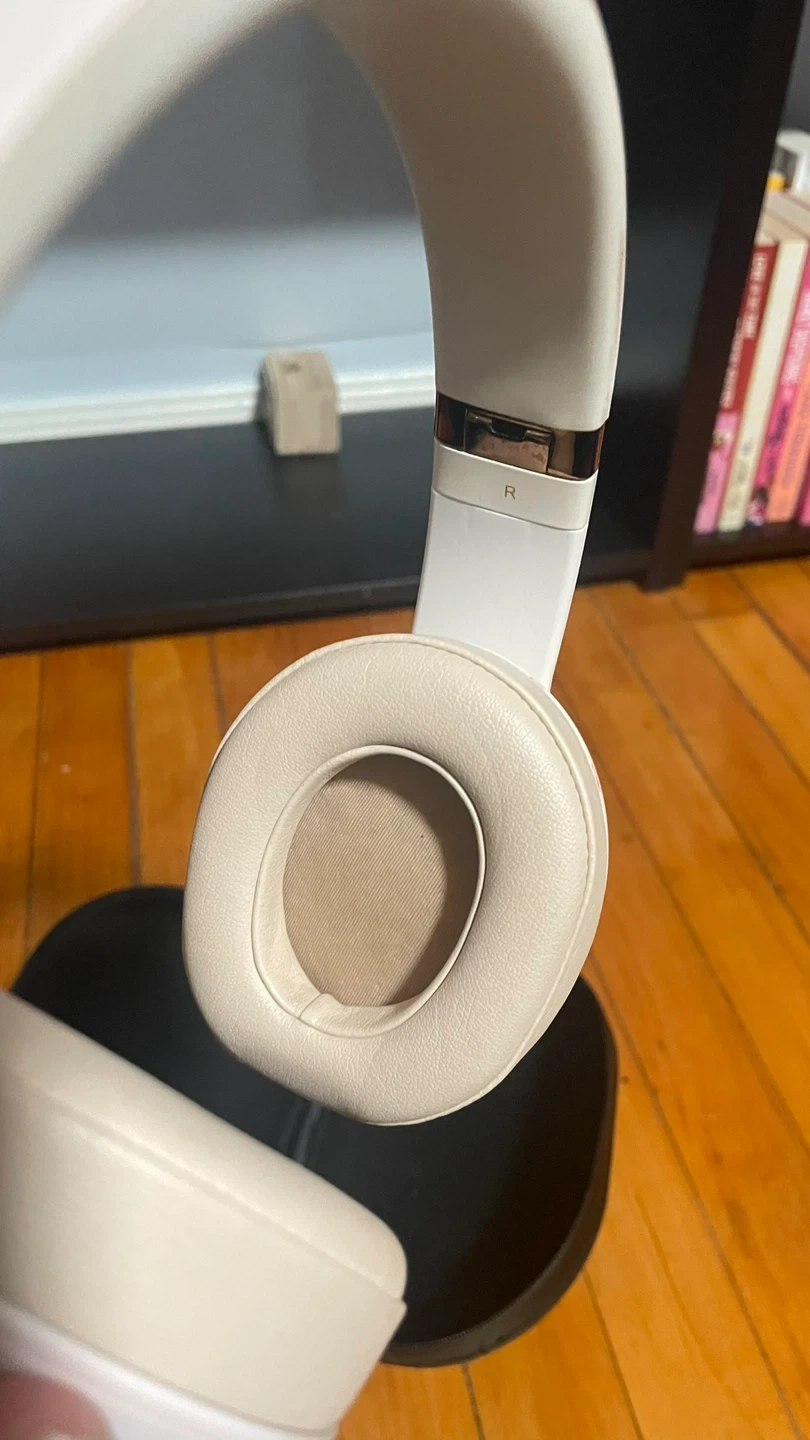 Selling a pair of Beats Solo3 wireless headphones in cream. They are in good condition and come with the carrying case. These headphones are known for their sound quality and comfortable fit!