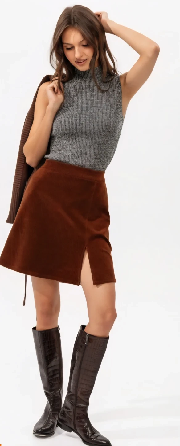 This J.NYC sleeveless top features a mock neck and a ribbed knit texture in a grey and black marled pattern. It's a size small. The stretchy material offers a comfortable fit. It can be paired with a Vintage Brown Corduroy Skirt with Slit. 👚✨ #Top #Knit #Fashion #Style
