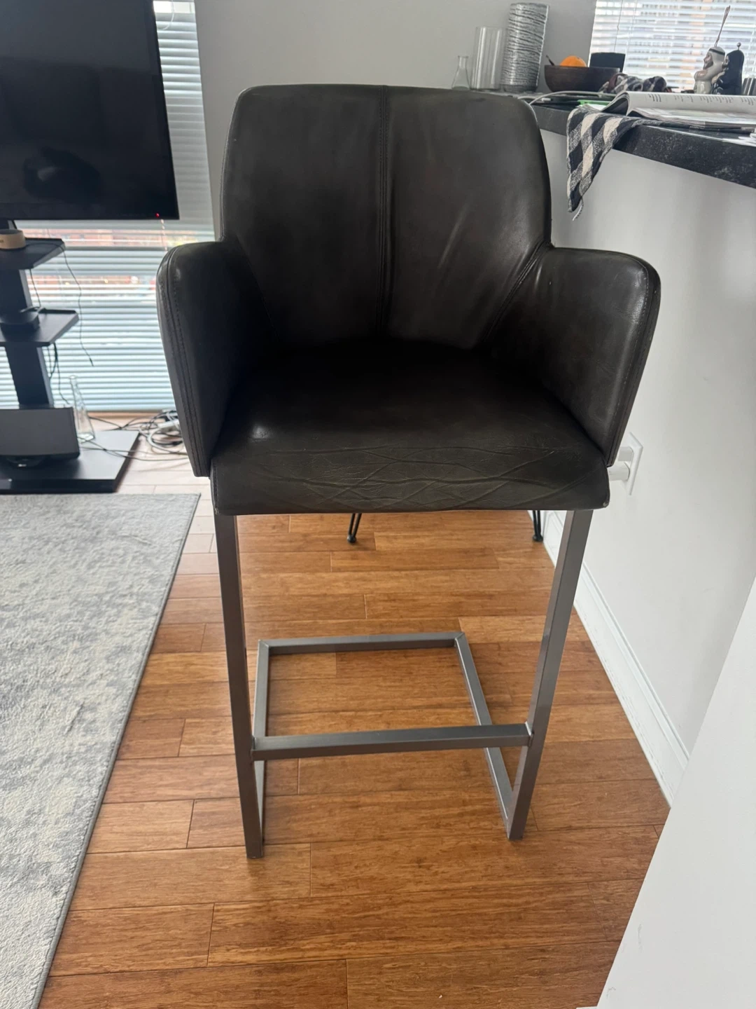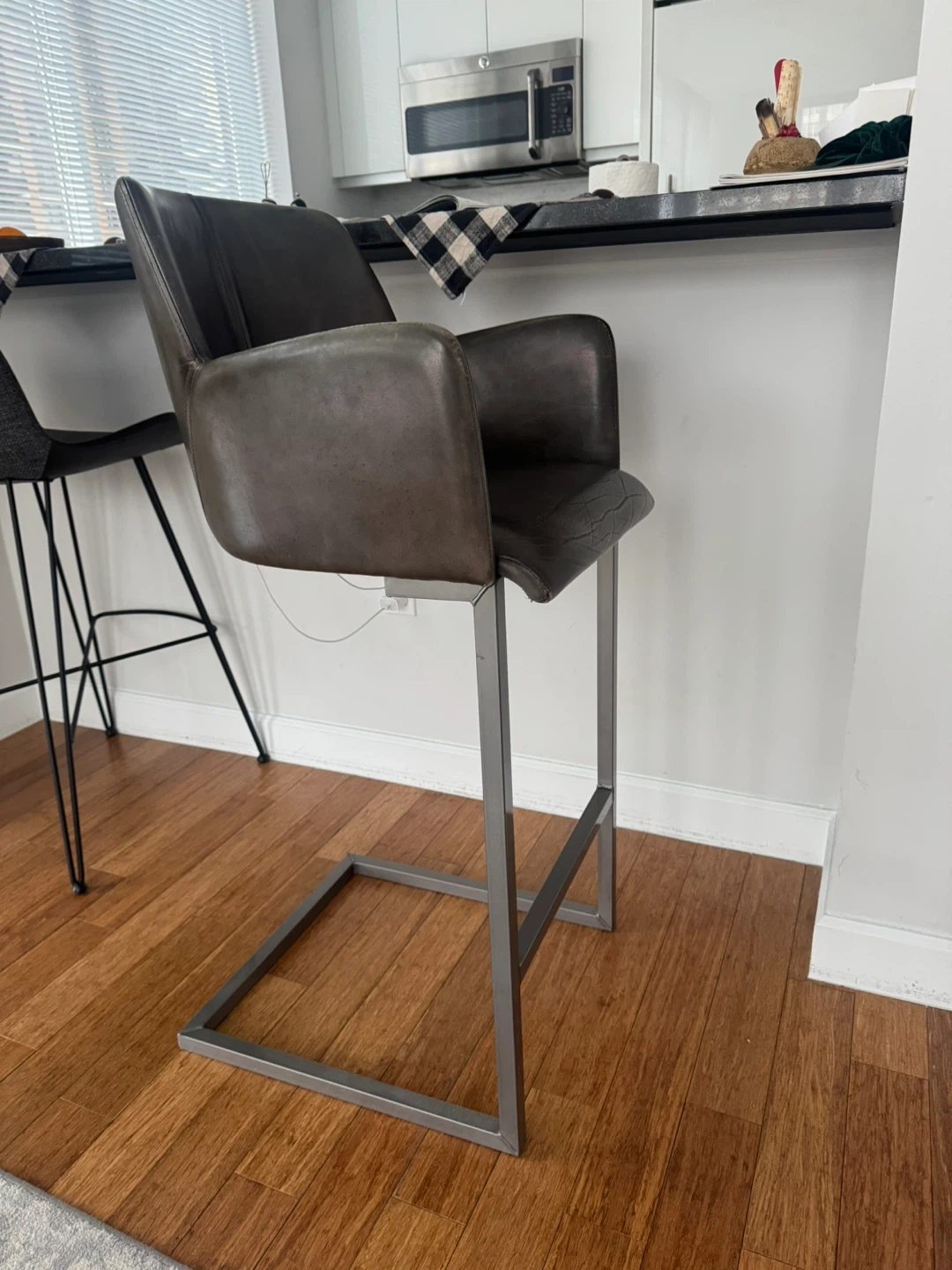 This bar stool features a comfortable upholstered seat and back. It has a sturdy metal base that provides stability. The dark upholstery offers a sleek look for your kitchen or bar area.