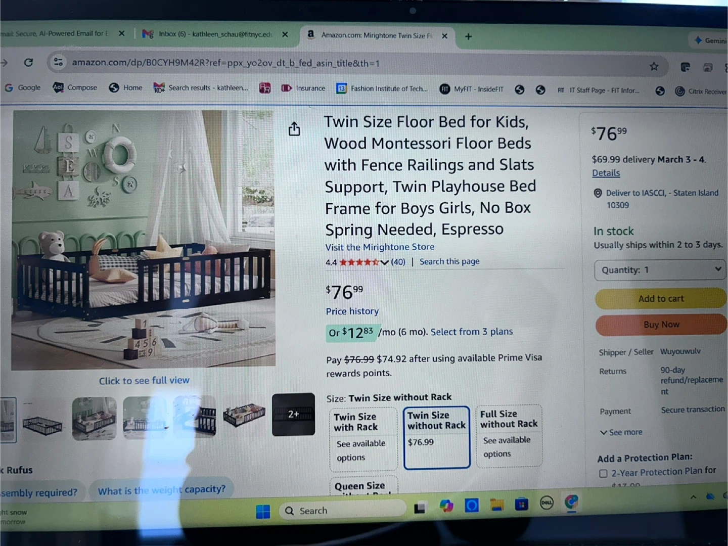This twin size floor bed features fence railings and a wood Montessori design. It's made with a twin playhouse bed frame and requires no box spring. The espresso finish is perfect for boys or girls rooms. Wood construction.