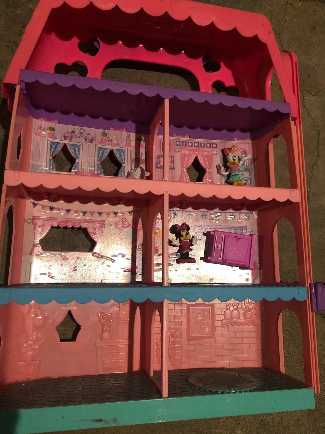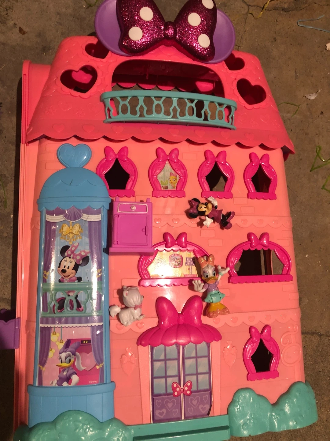 This is a Disney Minnie Mouse Happy Helpers Playhouse toy. It's pink and purple with Minnie and Daisy figures. Includes accessories like a bed and a dresser.