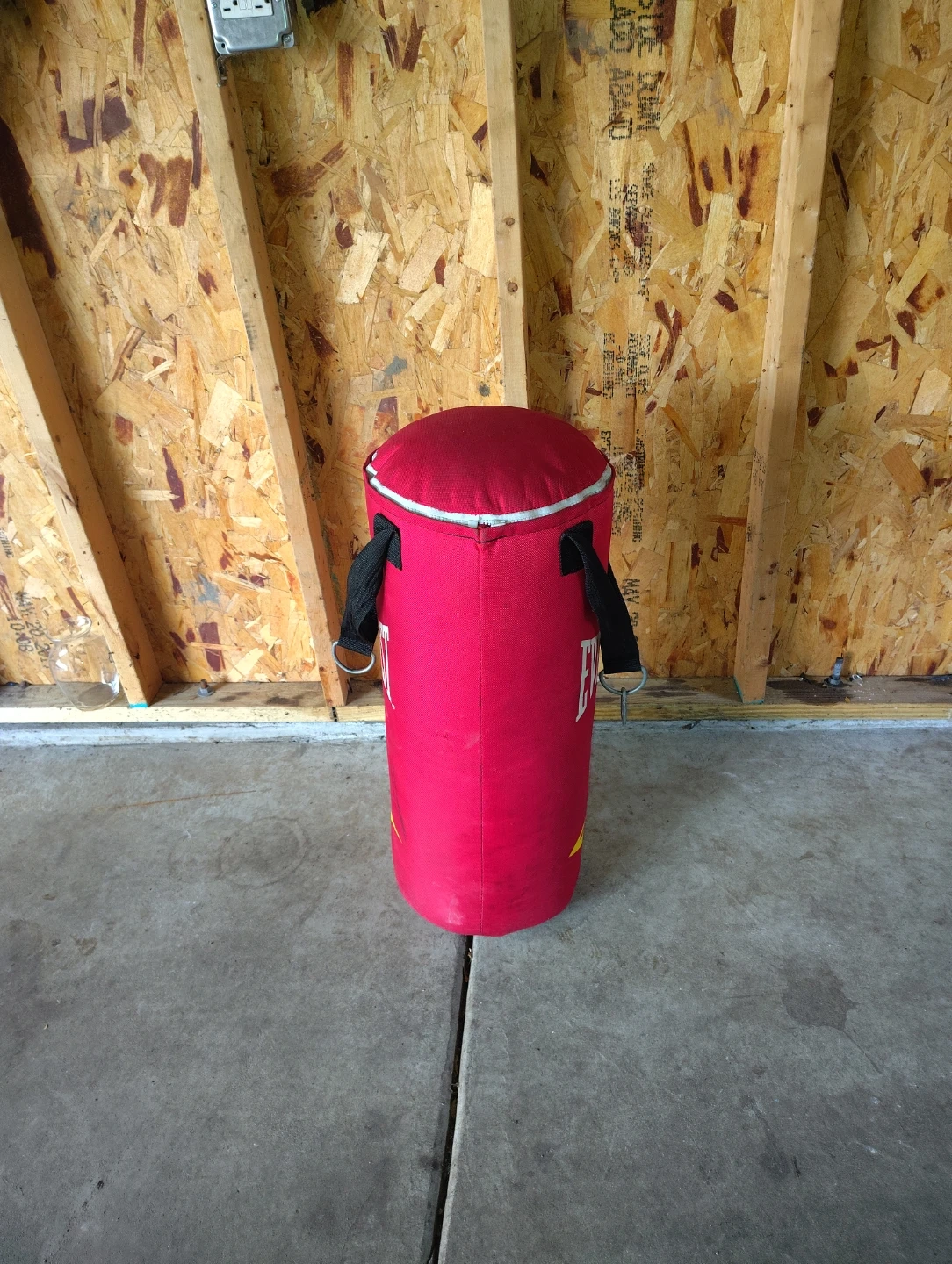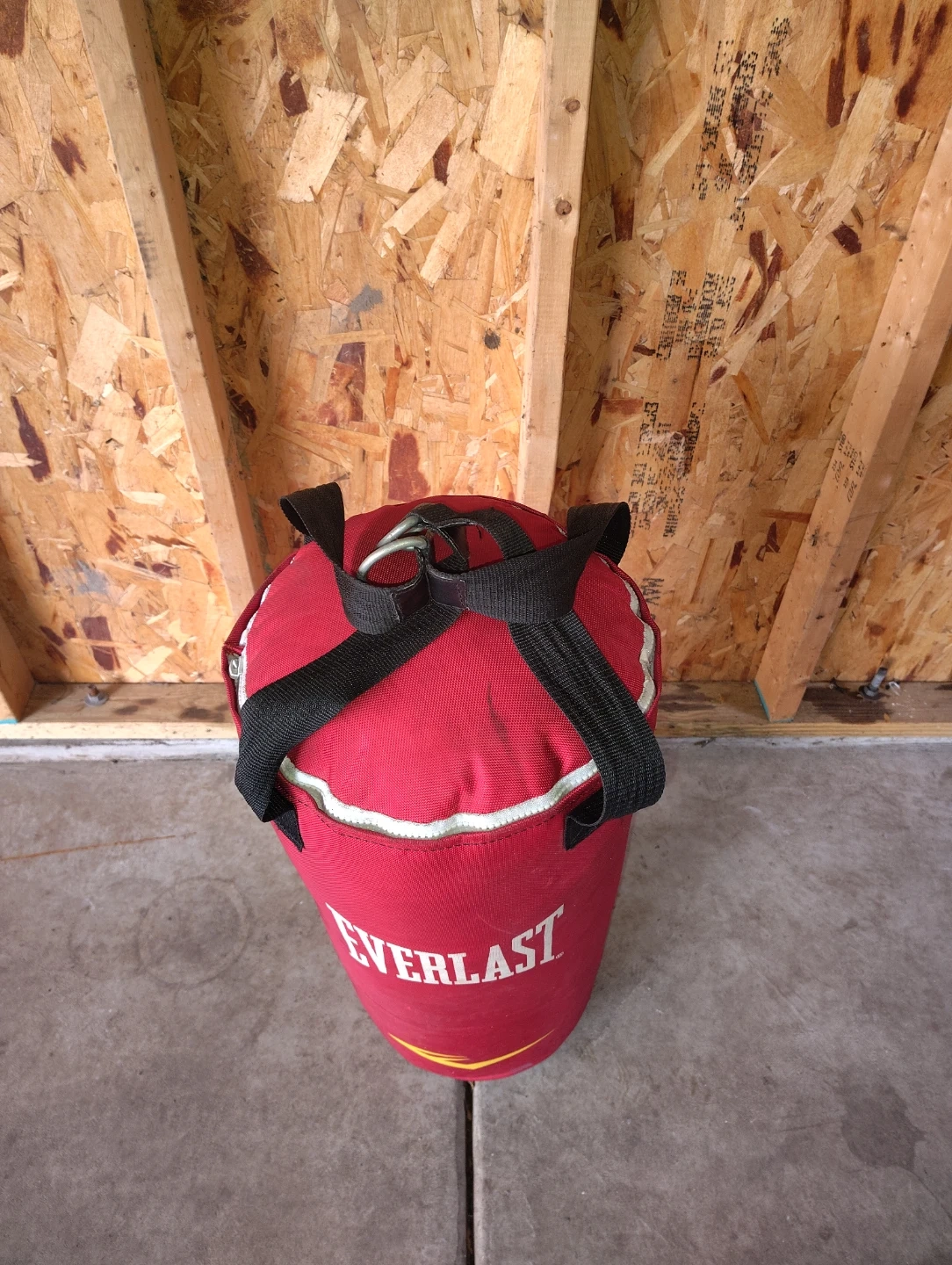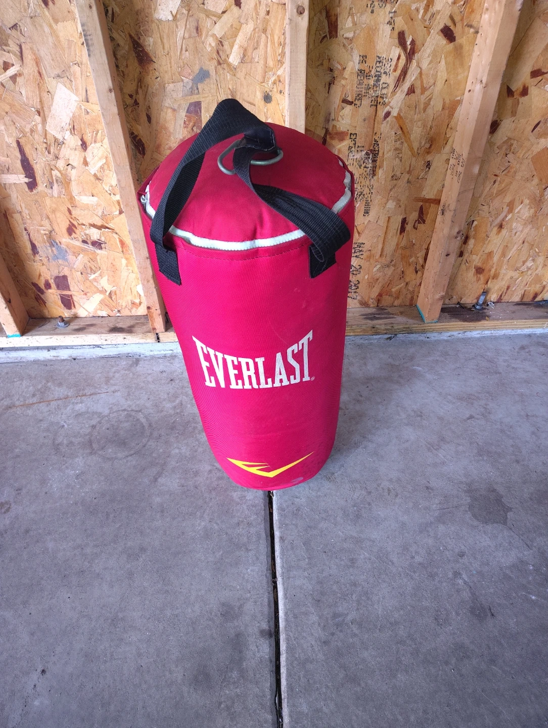 This is an Everlast punching bag. It's made of red fabric and has two black straps with metal D-rings for hanging. It's designed for boxing or martial arts training. Perfect for home gyms!