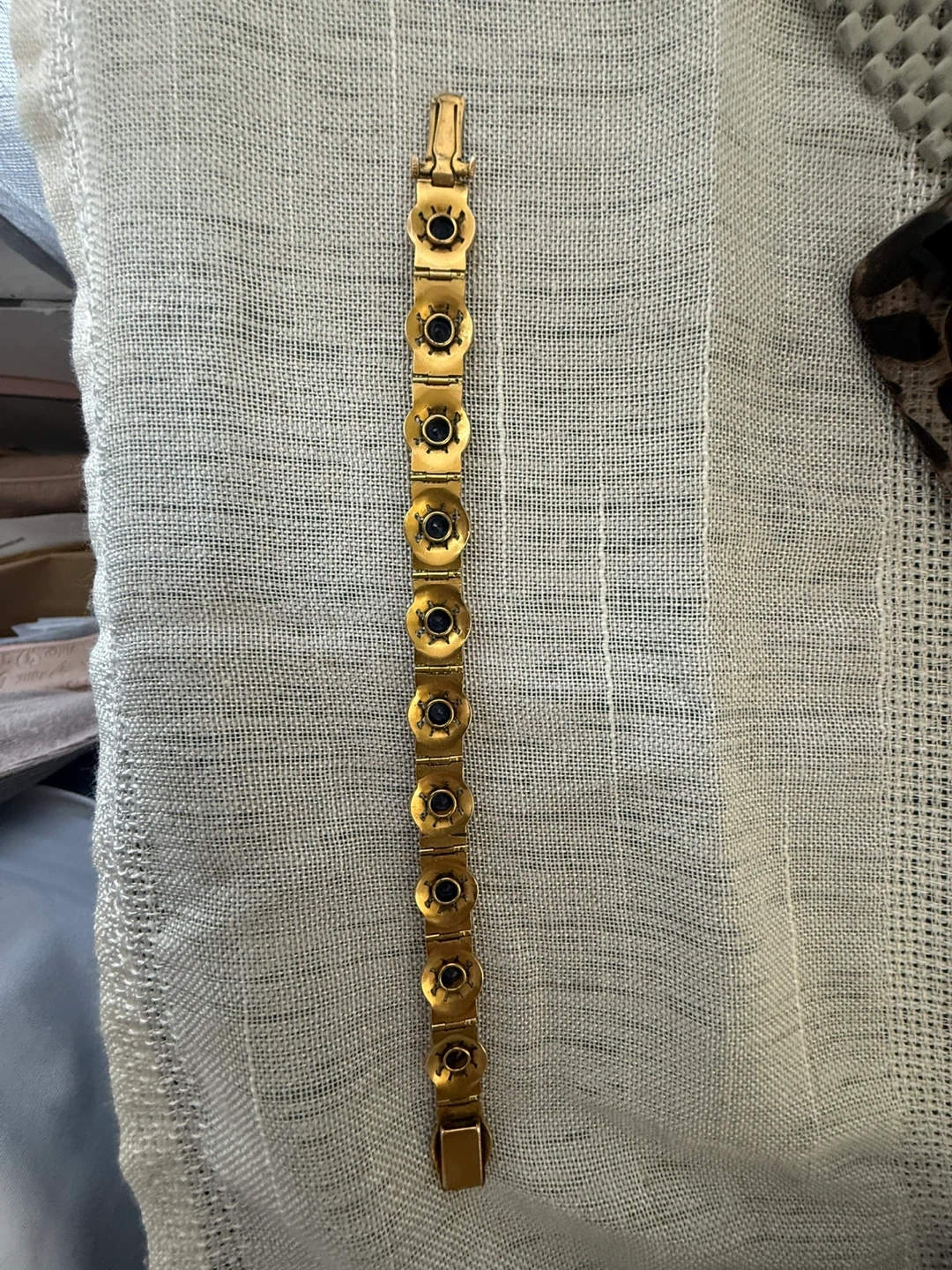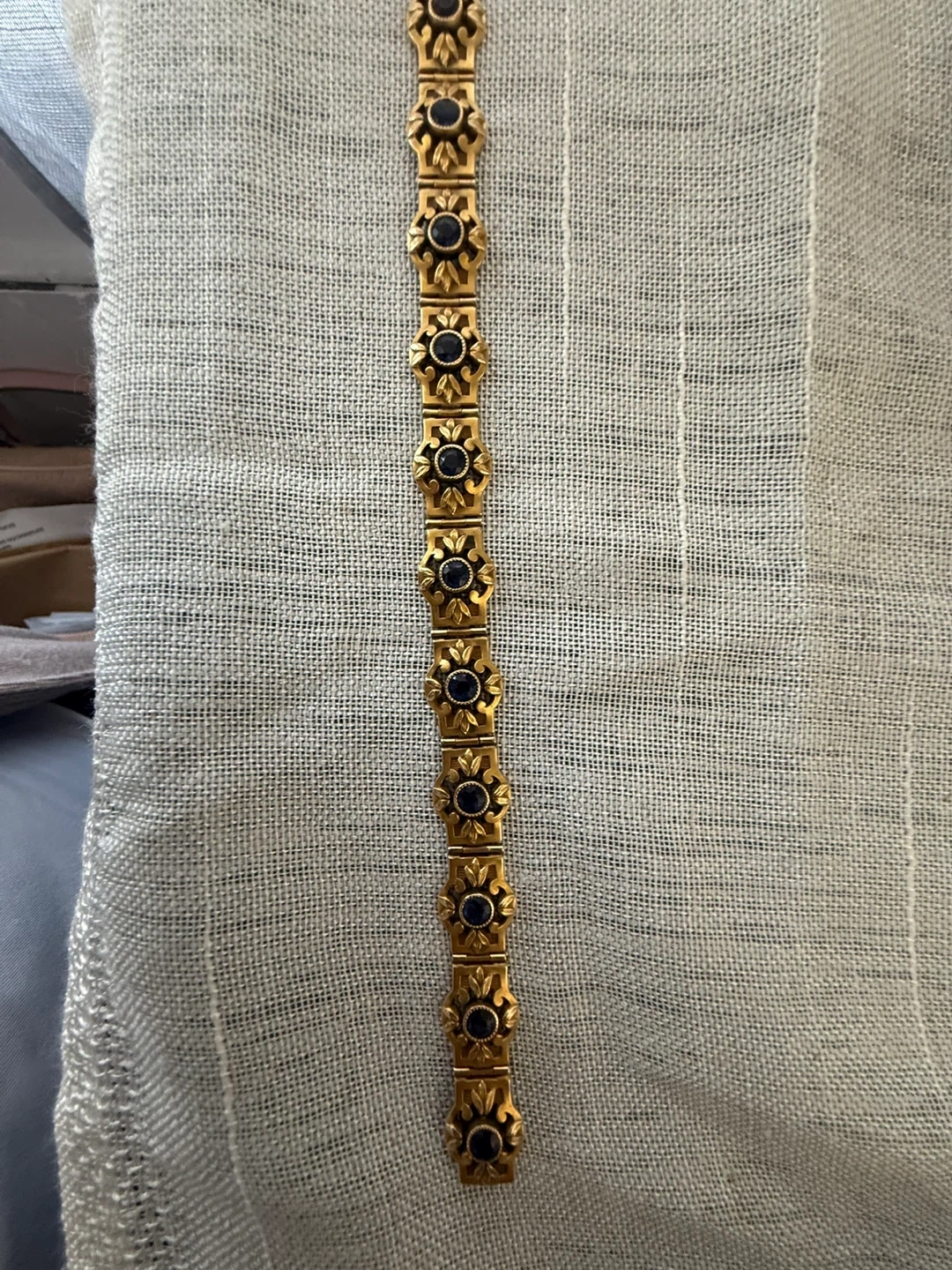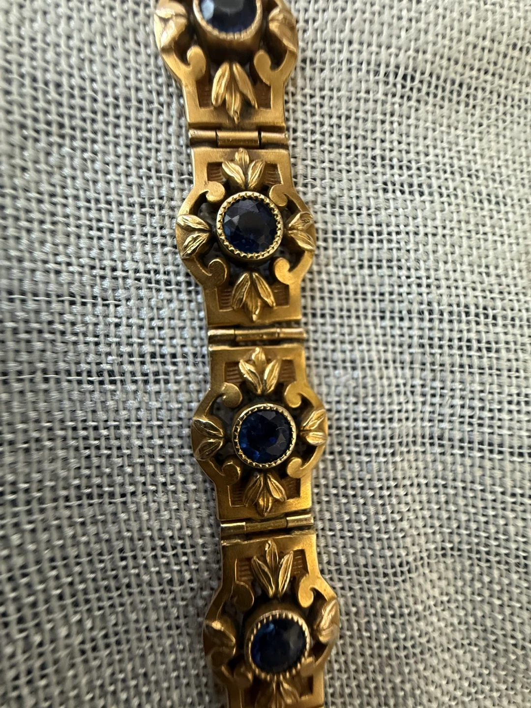 This bracelet features a gold tone metal with intricate detailing. It has a series of oval blue stones. The clasp is functional.