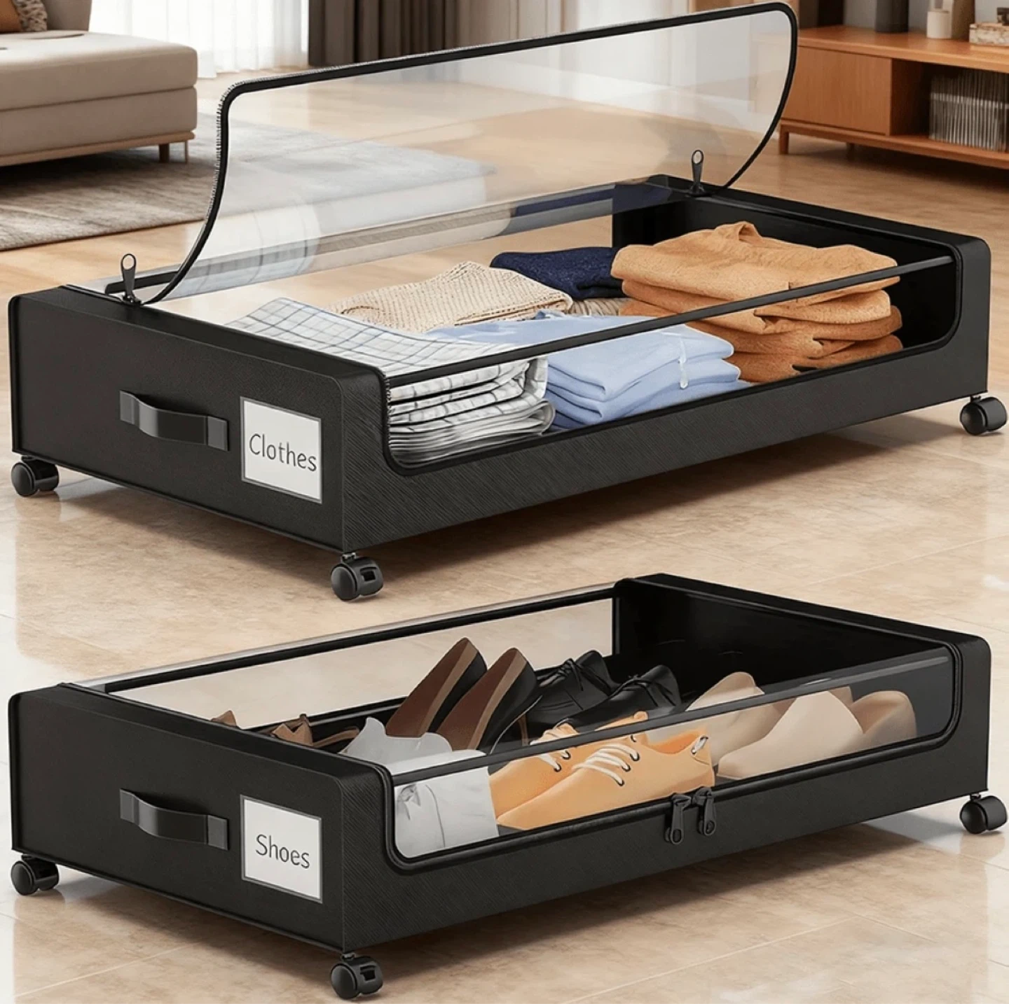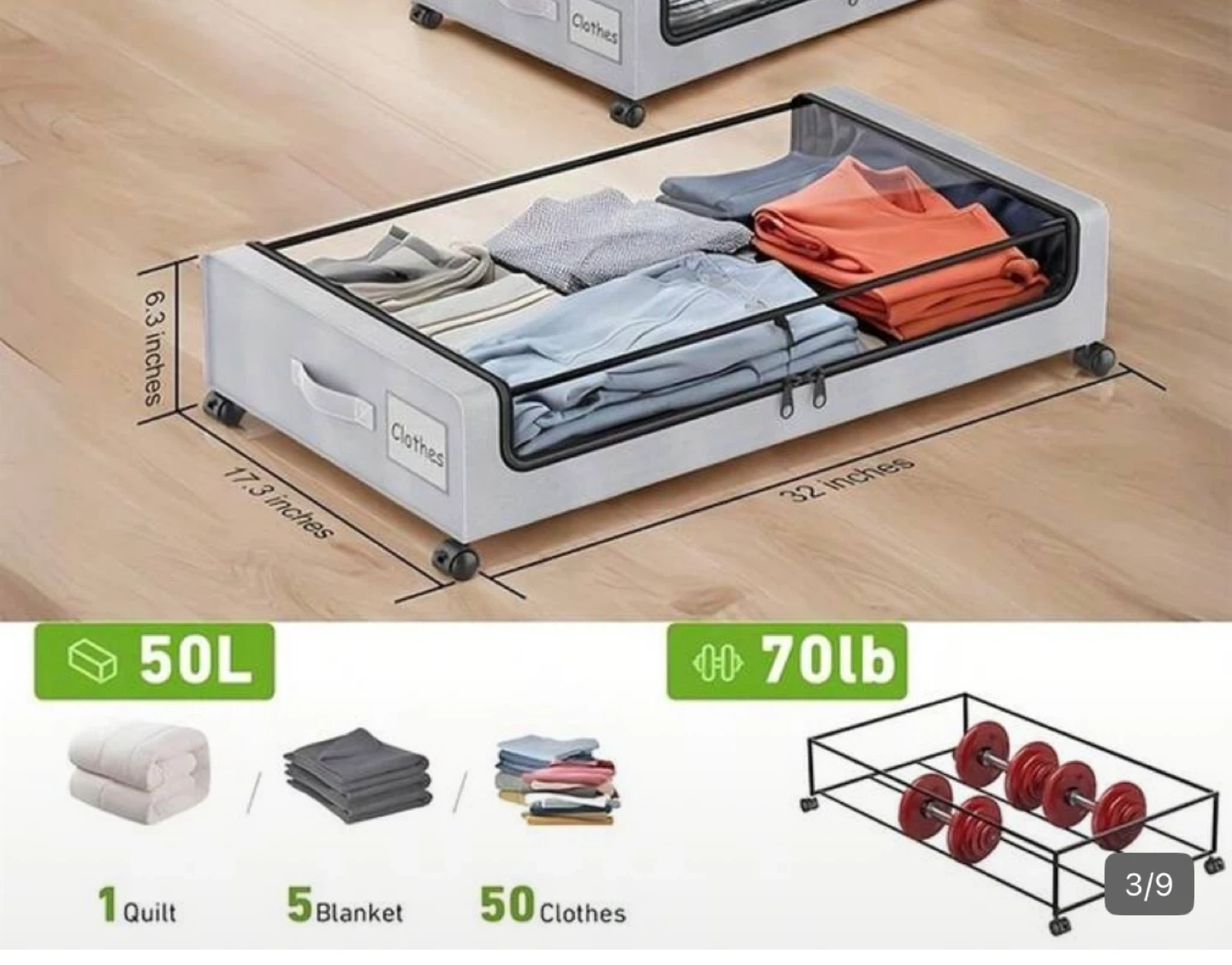 This under-bed storage box has a 50L capacity and comes with wheels for easy access. It's designed for storing clothes, shoes, and accessories, featuring a flip-top transparent lid. Dimensions are 32" L x 17.3" W x 6.3" H. It's great for keeping your living space tidy!